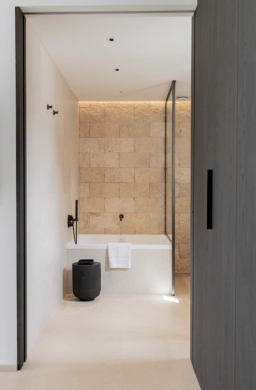 Rodeado por la vegetación típica de la zona, exteriormente el edificio de volúmenes irregulares está caracterizado por revestimientos en piedra bruta alternados con láminas lisas, todo en delicadas tonalidades color crema