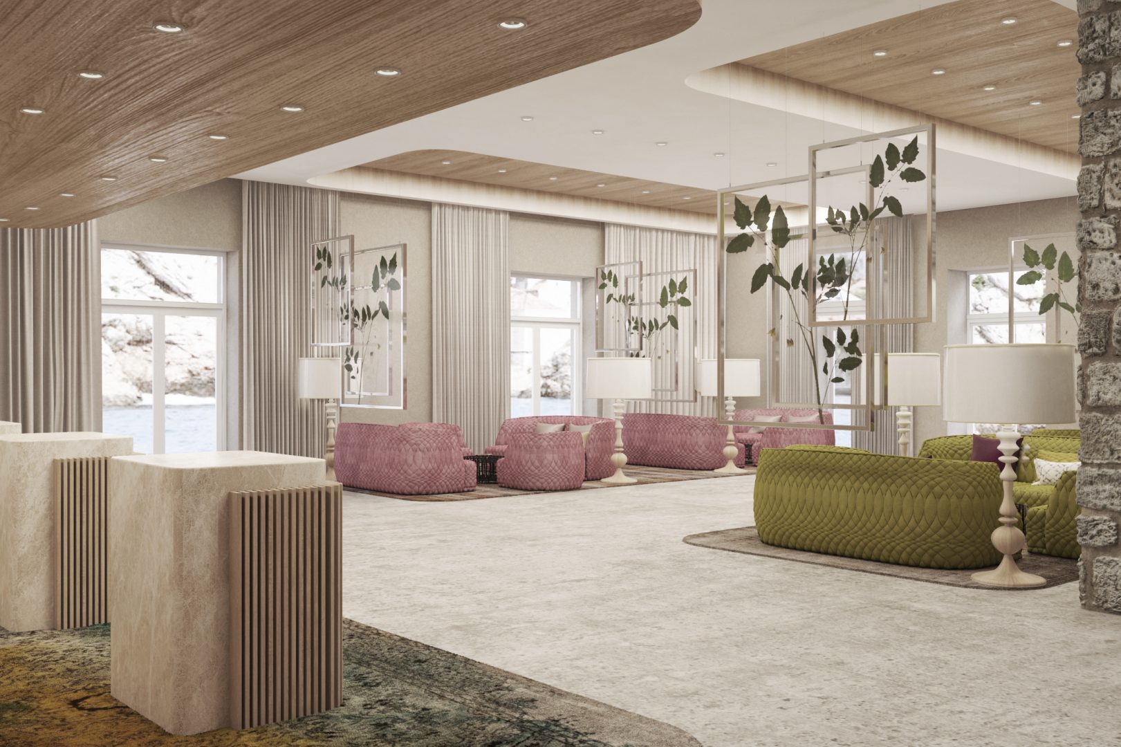 Nel progettare l'area del foyer, l'obiettivo principale è l'accurata integrazione degli edifici esistenti, come i muri in pietra naturale originale, nel nuovo concept spaziale
