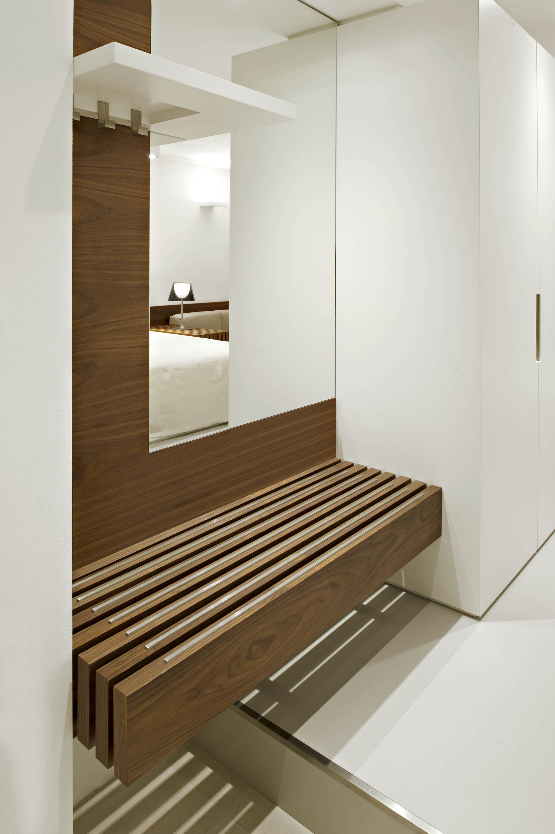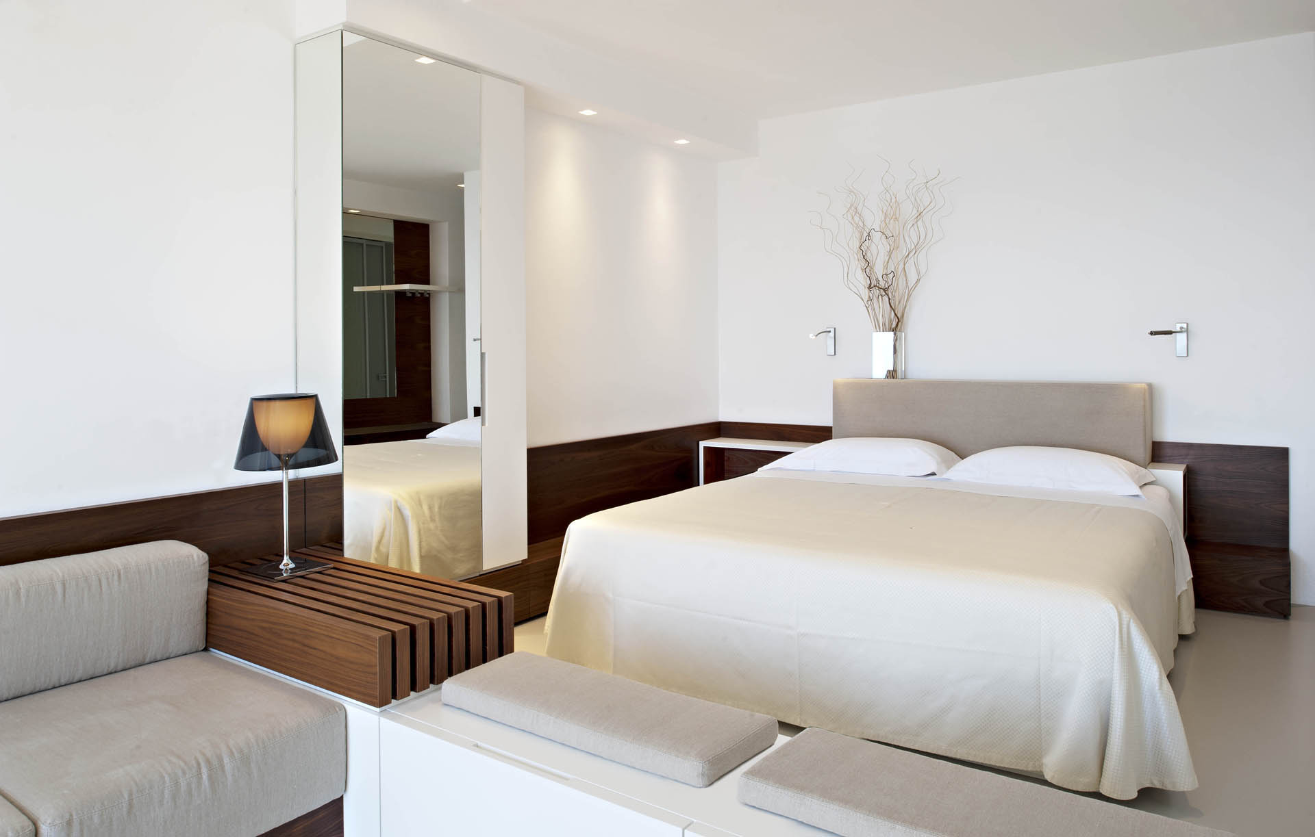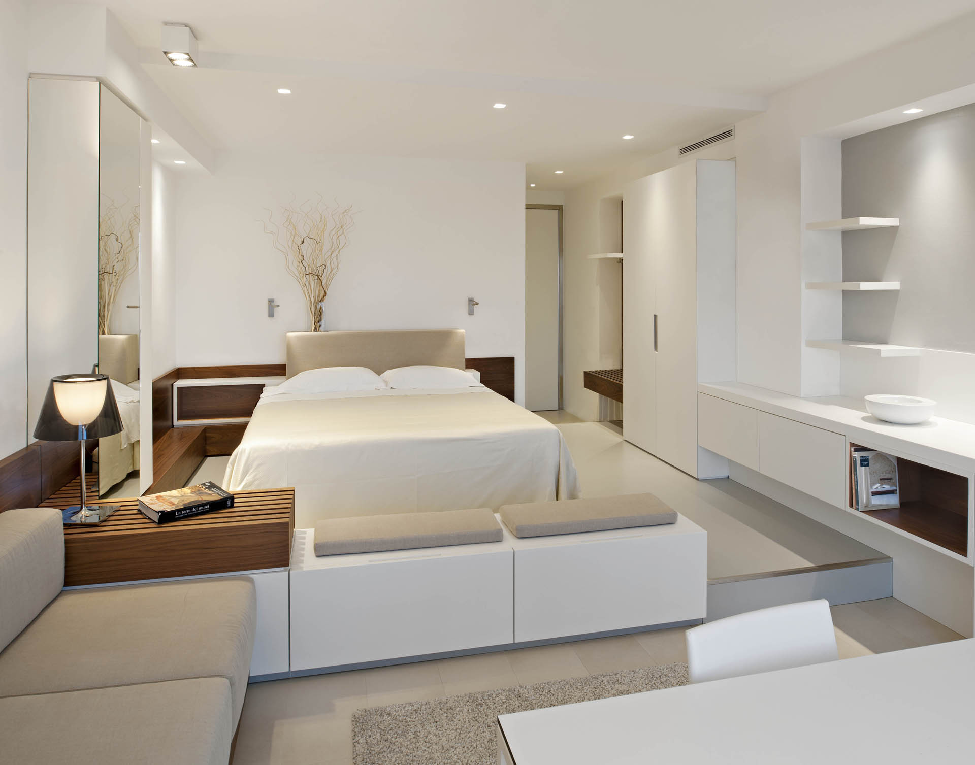 La Arquitecta crea un lugar fresco y relajante, que es acogedor pero también tónico y vital. El color dominante del mobiliario es el blanco, que en contraste con el nogal de Canaletto diseña y determina el impacto del espacio. Mientras que el color blanco da una apariencia de frescura, limpieza, la presencia de la madera y las telas transmiten una sensación de confort y armonía