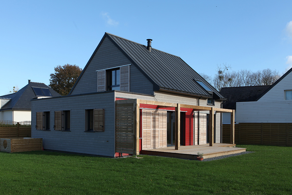 El proyecto que ya estaba en marcha ha sido rediseñado por el arquitecto Patrice Bideau para adaptarse a las nuevas regulaciones energéticas. Partiendo de un marco combinado de madera y hormigón, se decidió construir una casa de alta eficiencia energética en un área ambiental protegida
