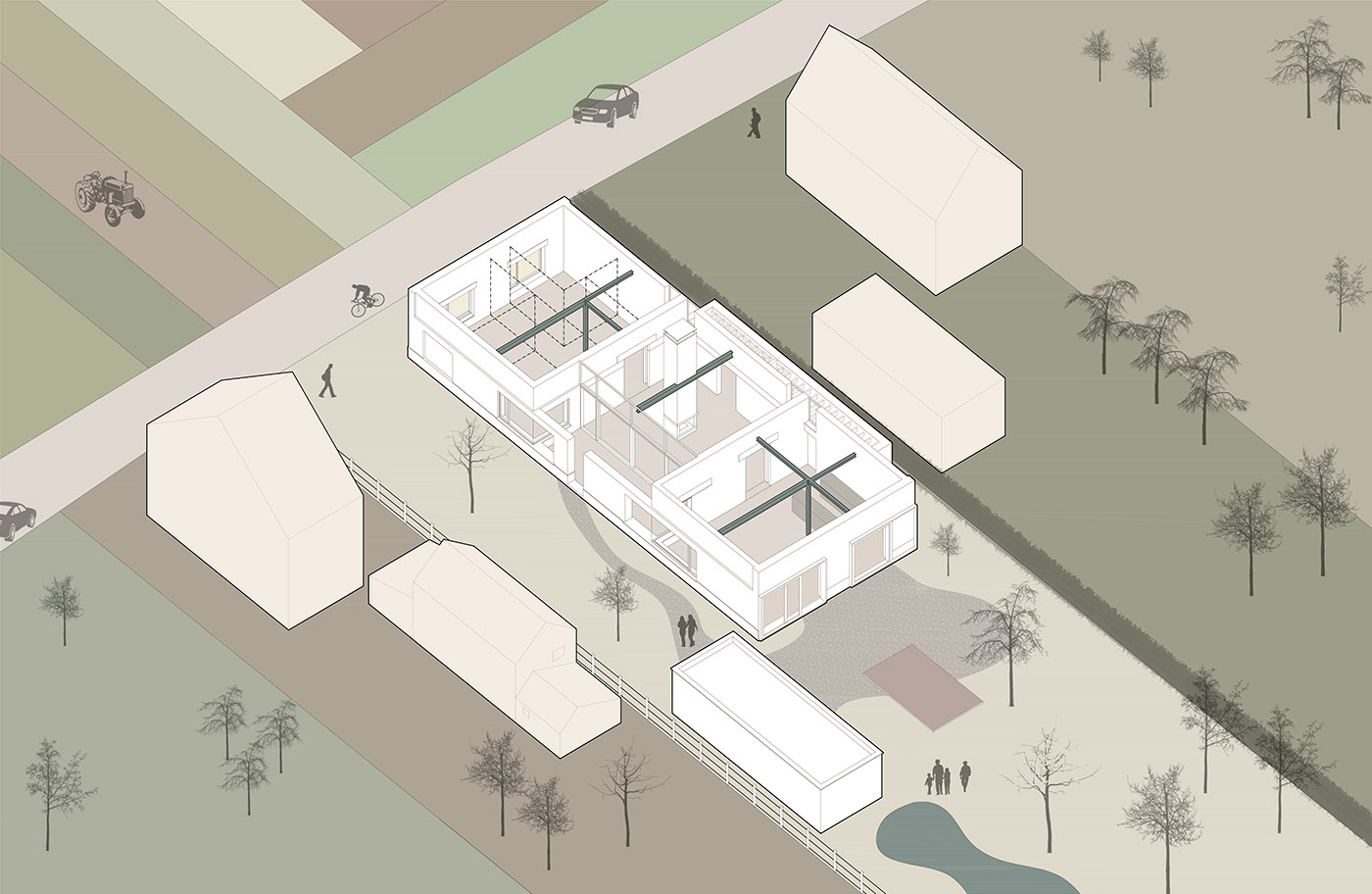 Por amor y respeto al contexto constructivo típico flamenco, con sus ampliaciones y añadidos, los arquitectos decidieron reservar el espacio de servicio para el volumen de la dependencia original, sin afectar a las tres nuevas grandes "plazas".