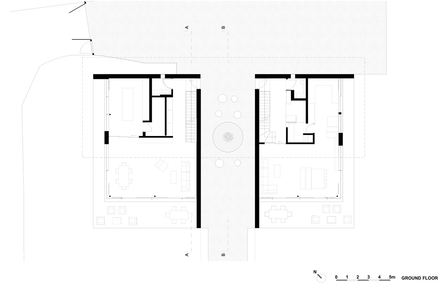 El estudio de arquitectura y diseño monovolume architecture + design diseñó la Casa P2 como un juego de espejos, duplicando los elementos para las dos unidades residenciales solicitadas por el cliente: dos entradas independientes y ocultas, dos espacios exteriores ocultos, dos jardines con sus correspondientes espacios para animales, gatos en un lado y tortugas en el otro, todo ello unido por el patrón de la fachada deslizante que alterna entre un módulo y otro. En el centro del volumen arquitectónico, un elemento natural, el ciprés, atraviesa la planta baja y se eleva hasta la logia, mirando hacia el cielo
