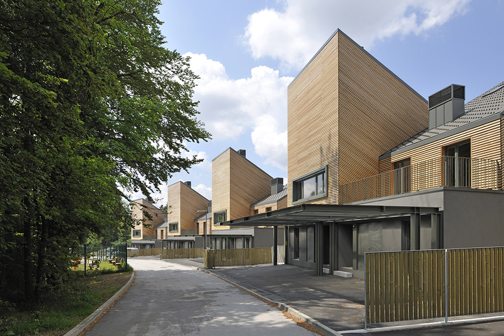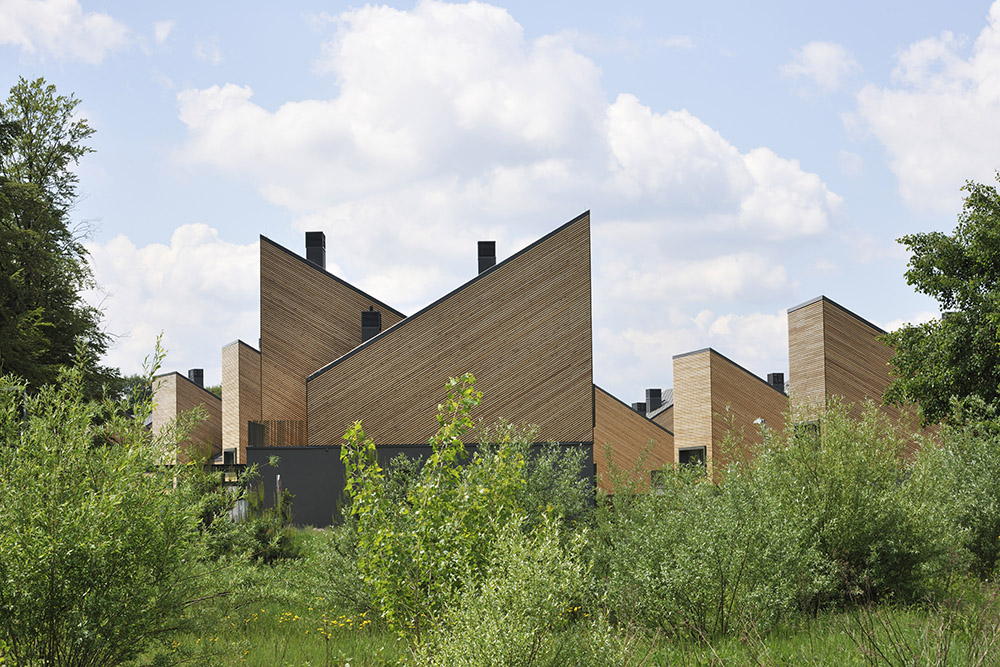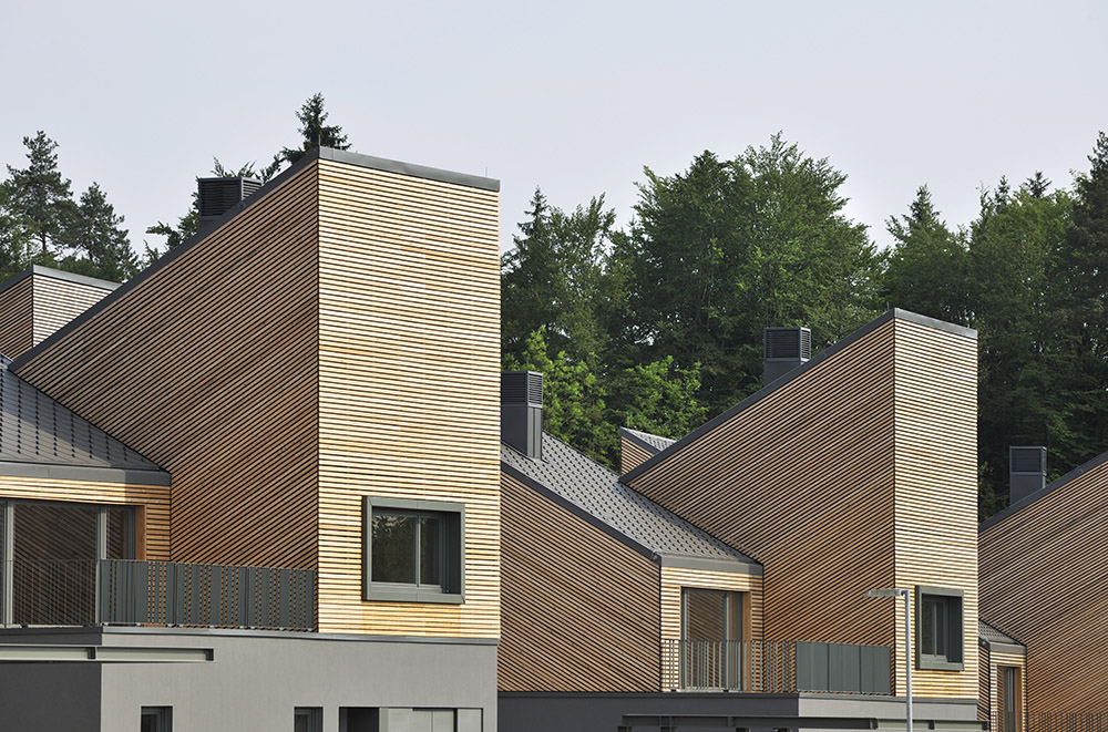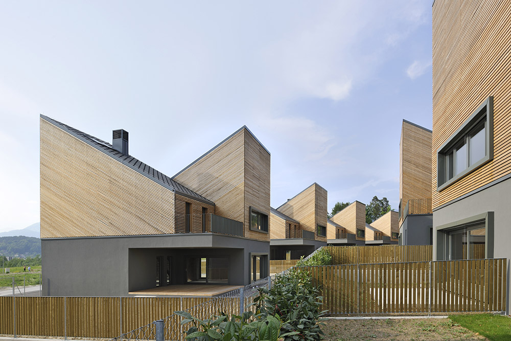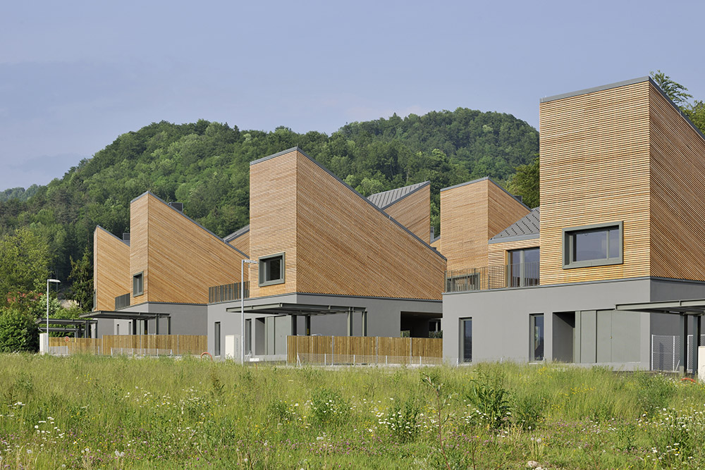 Studio Dekleva Gregoric Arhitekti diseña viviendas de bajo consumo energético en un pequeño asentamiento del sur de Eslovenia, utilizando materiales naturales elementales, como ladrillos de arcilla y revestimientos de listones de madera, en armonía con las pendientes del fondo