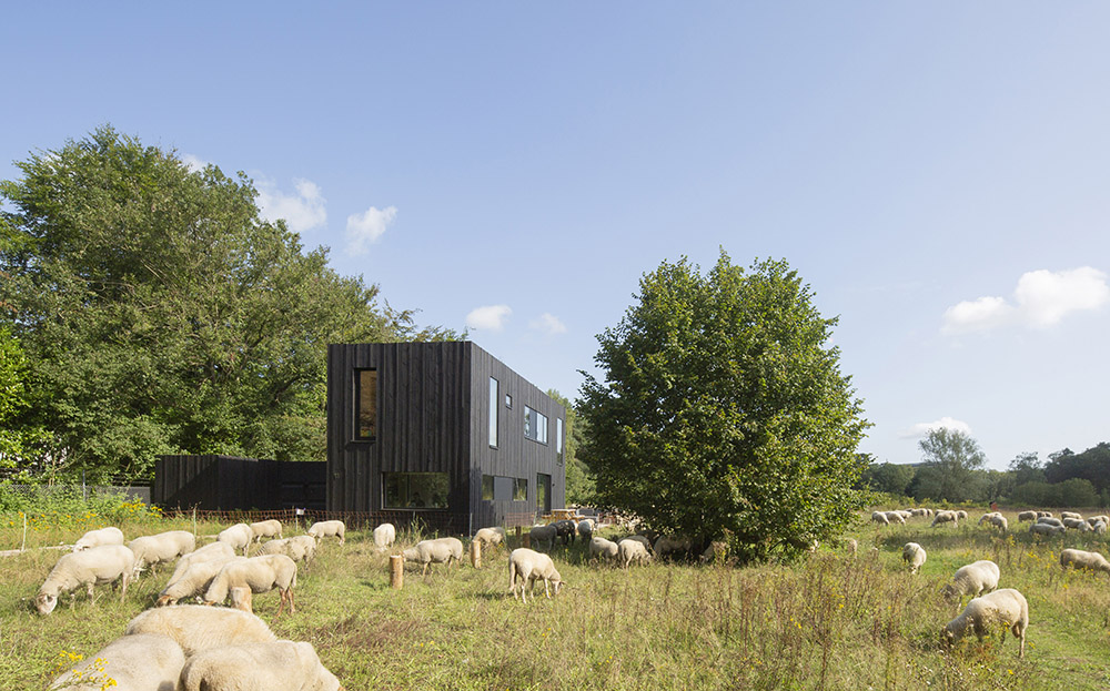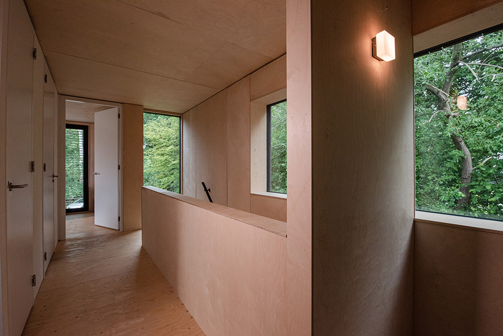 La casa se construye de forma sostenible: la estructura es prefabricada y está compuesta de cajas de madera rellenas de aislamiento de lino. La fachada ha sido tratada con un hongo para evitar que se dañe el revestimiento de madera. Al igual que el exterior, el interior está hecho de madera, creando una atmósfera rural