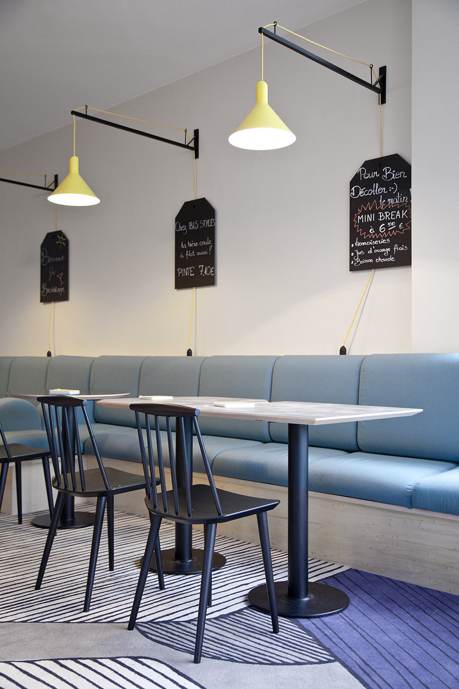 El proyecto prefigura el nuevo concepto de diseño para los bares de los hoteles de la marca Ibis Styles. Más que un bar, se ha querido expresar el concepto de café tomando como punto de partida que el hotel también es un lugar social. Partiendo de la diversidad de los huéspedes del hotel y la variedad de sus necesidades, se ha definido un espacio atípico pero familiar que multiplica las posibilidades de uso del lugar