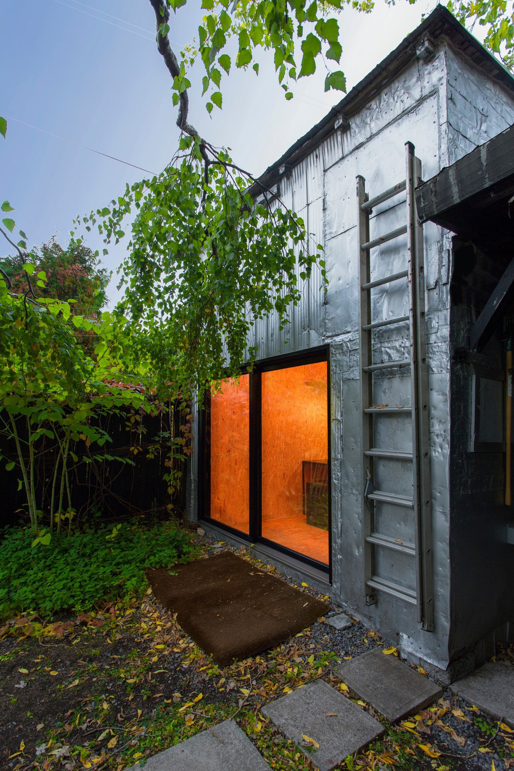 L'architetto inserisce il progetto in un edificio esistente, vecchio hangar eretto alla fine del giardino della sua residenza in Canada. L'effetto scultoreo, di grande semplicità, rivela una vera complessità che si oppone alla nitidezza delle forme