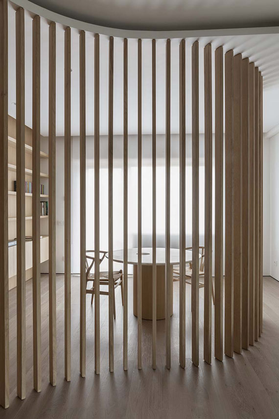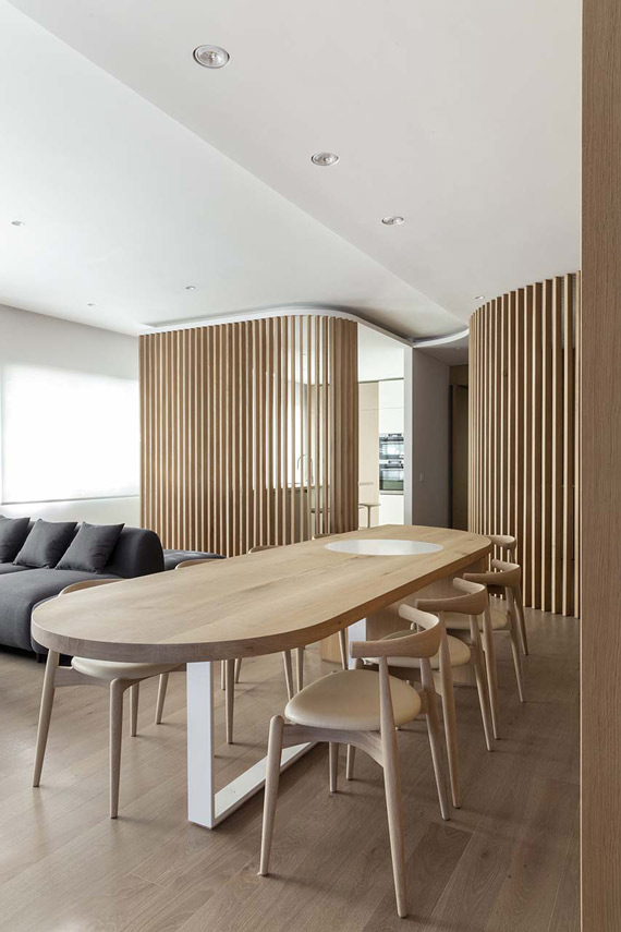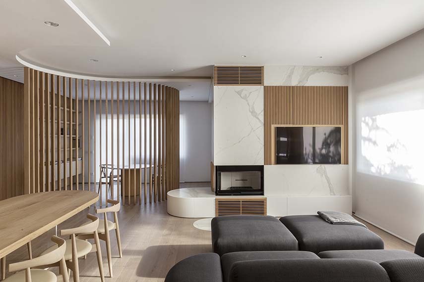 El estudio del arquitecto Filippo Bombace diseña los interiores de Casa Recta Curva siguiendo el diseño exterior y utilizándolo para la definición de las particiones internas y de todos los elementos de mobiliario. La atmósfera de la vivienda se completa con la identificación material y cromática de la intervención basada en el contraste entre paredes blancas y el uso generalizado de madera de roble, con algunos insertos de mármol calacatta