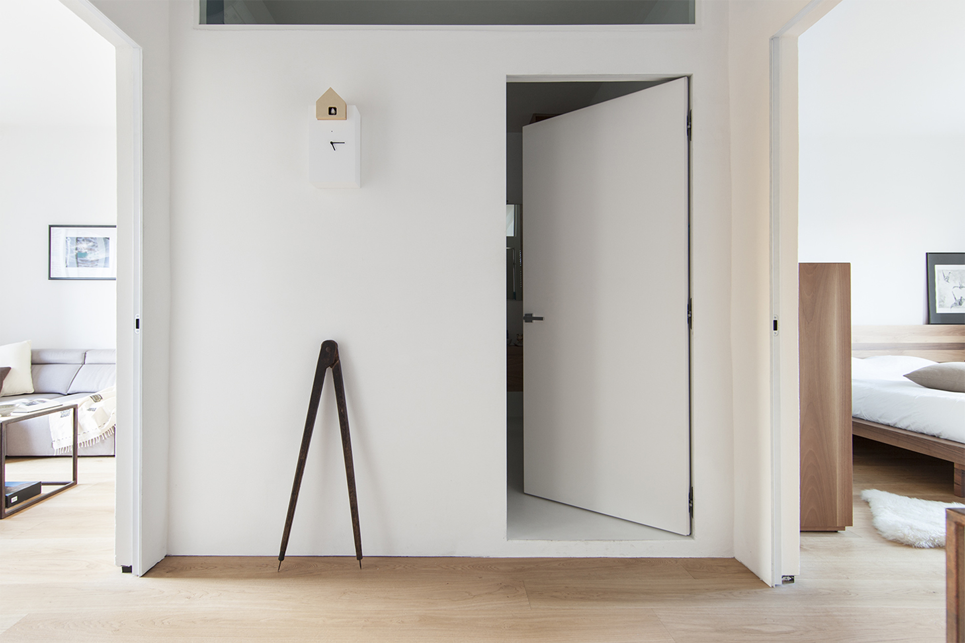 Las habitaciones se desarrollan alrededor del hall de entrada, donde hay una gran abertura de vidrio que ilumina el baño. Este espacio se convierte en el interior de un cubo completamente blanco y silencioso en el que la percepción del espacio varía según la apertura o el cierre de las puertas