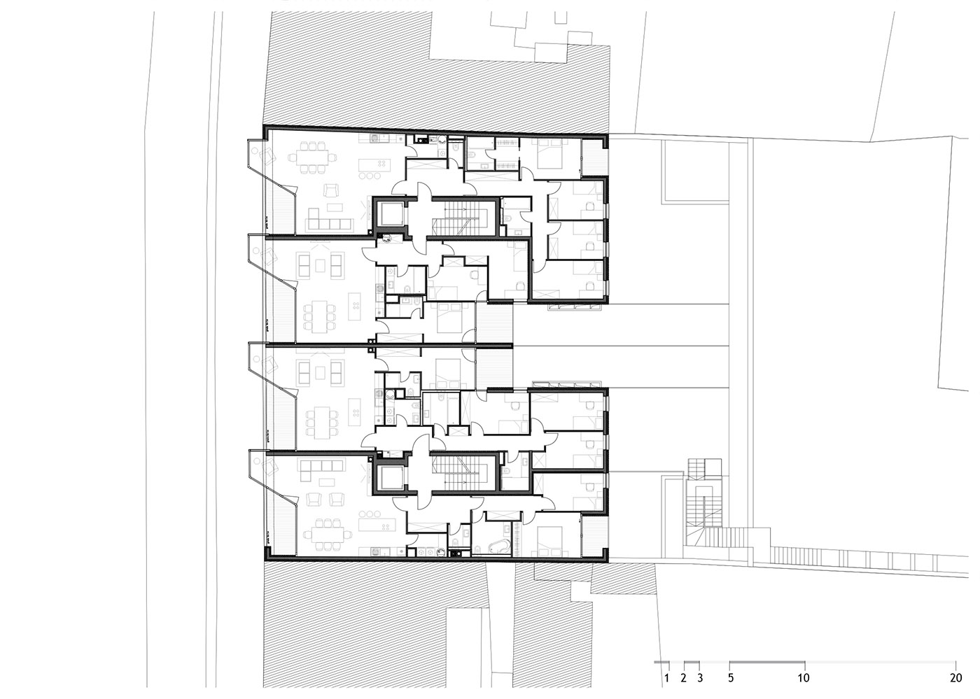 Interpolation B, en la plaza Britanski, en el centro de Zagreb, es un edificio de apartamentos de 22 unidades residenciales, en su mayoría grandes, con una orientación bilateral. El edificio cuenta con seis niveles sobre rasante y tres plantas subterráneas, donde se ubican las plazas de aparcamiento y los garajes