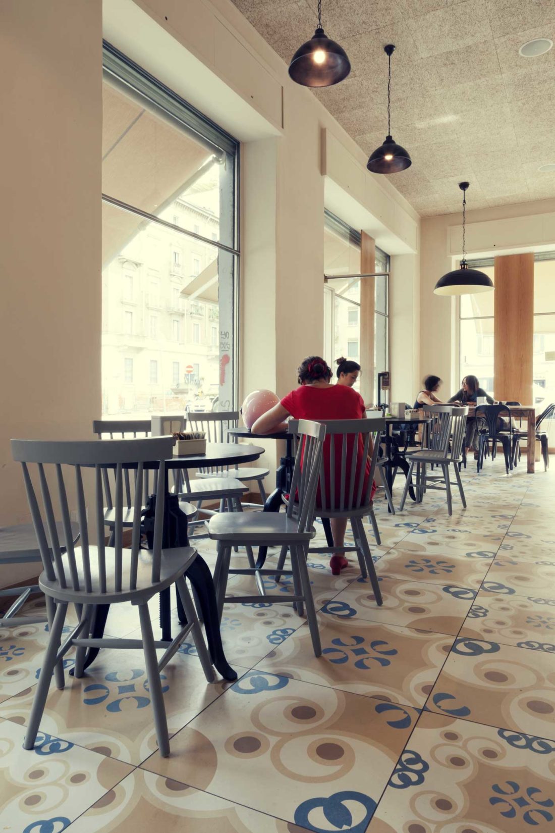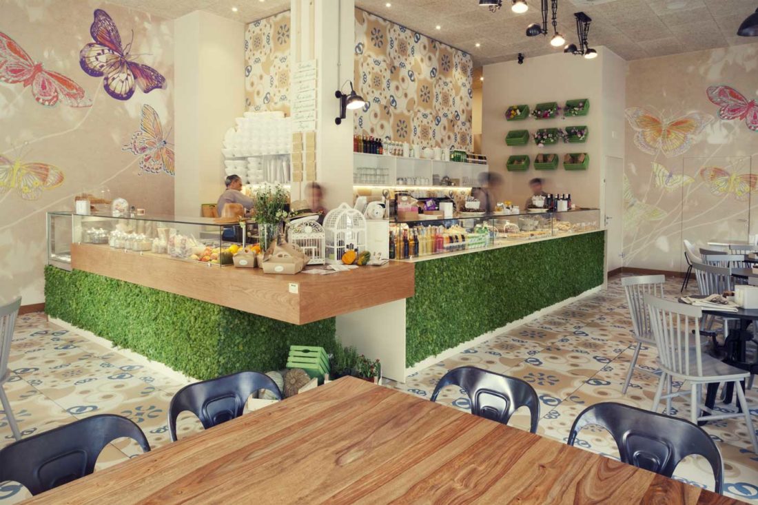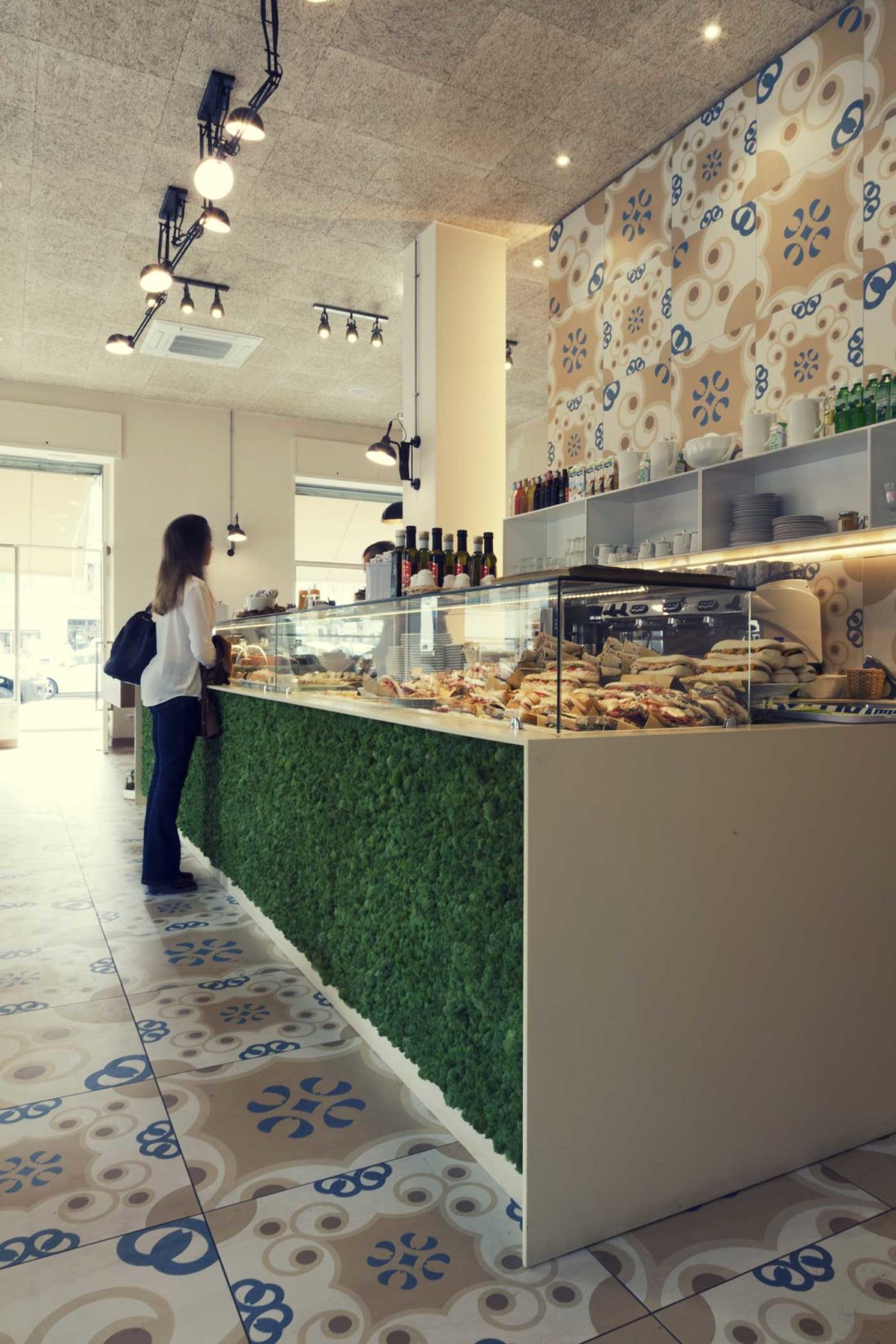 El local, completamente diseñado por Maja Group, que se encarga de los interiores, ocupa el lugar de una antigua papelería. Un juego de armonías y contrastes hace que el espacio sea único, las luces y el mobiliario vintage se interponen en el camino del banco en blanco corian y el musgo estabilizado. Otros protagonistas del espacio son los delicados papeles pintados de Wall&Decò, que representan un vuelo de mariposas y el piso con una decoración vintage que evoca las antiguas cementine