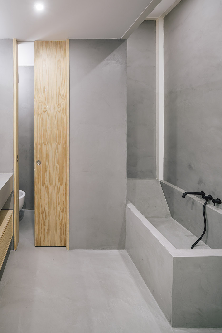 La estructura utilizada es lo más fina posible, por lo que se optó por un sistema metálico dentro del cual se encierran las instalaciones. El resto de los materiales imitan las paredes blancas y la madera existente. Gracias a la opacidad del vidrio que encierra el espacio intermedio de la estructura, la privacidad está garantizada. La transparencia o no del vidrio se debe a la necesidad de privacidad