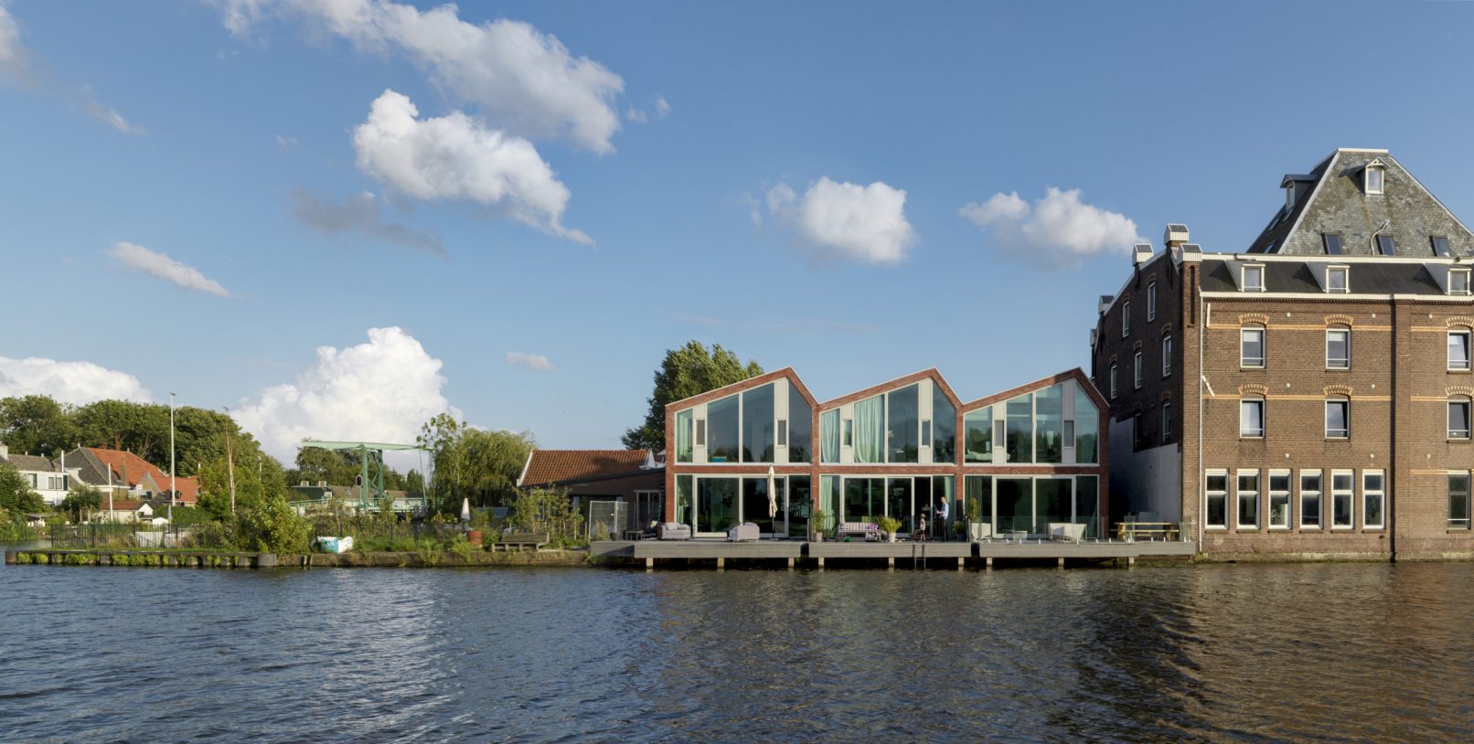 Las tres casas del muelle, diseñadas por el estudio Denkkamer en la antigua fundición de hierro y metal de Egmond&Zonen en Overschie, transformadas en un ambiente de vida especial, están cargadas de componentes marítimos e industriales, con techos de cobertizo