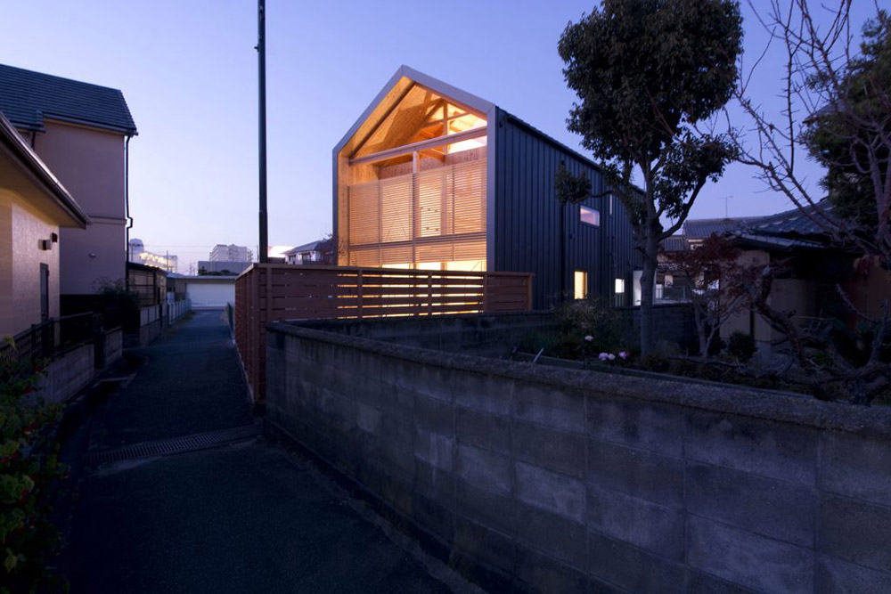 Por el contrario, las paredes del interior están cubiertas con madera de cedro, una madera de aspecto cálido ideal para interiores. Al atardecer, la luz ilumina el interior y el exterior de la casa, dando luz a toda la calle