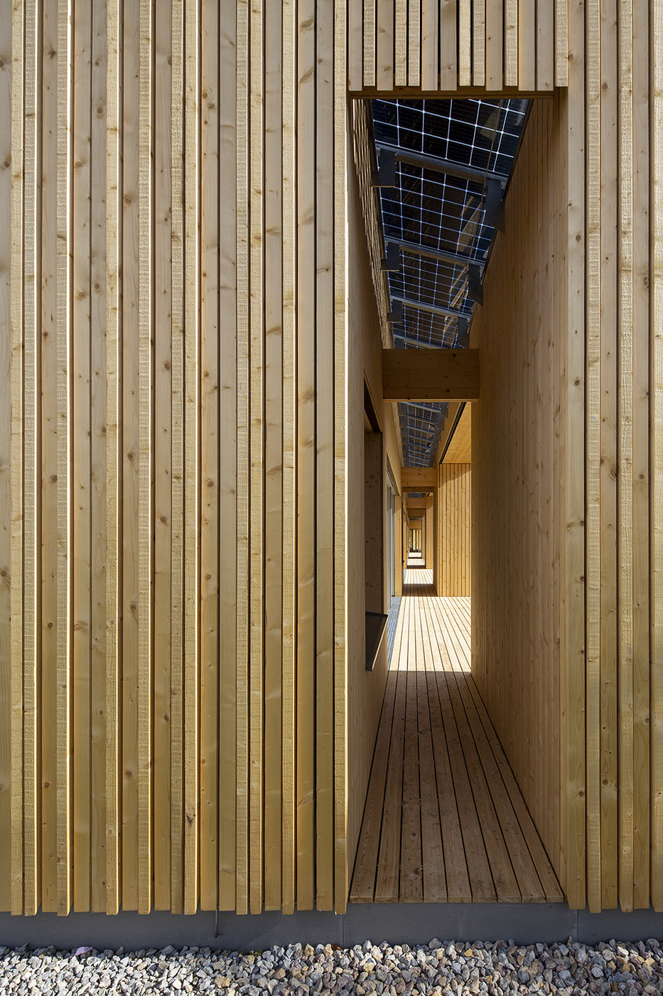 En la elección de los materiales del proyecto, se optó por materiales de construcción renovables y respetuosos con el medio ambiente, como la madera de abeto rojo local. Un gran sistema fotovoltaico proporciona gran parte de la electricidad necesaria, una bomba de calor proporciona la energía necesaria para la calefacción y un sistema de ventilación con intercambiador de calor garantiza una mejor calidad del aire durante todo el año