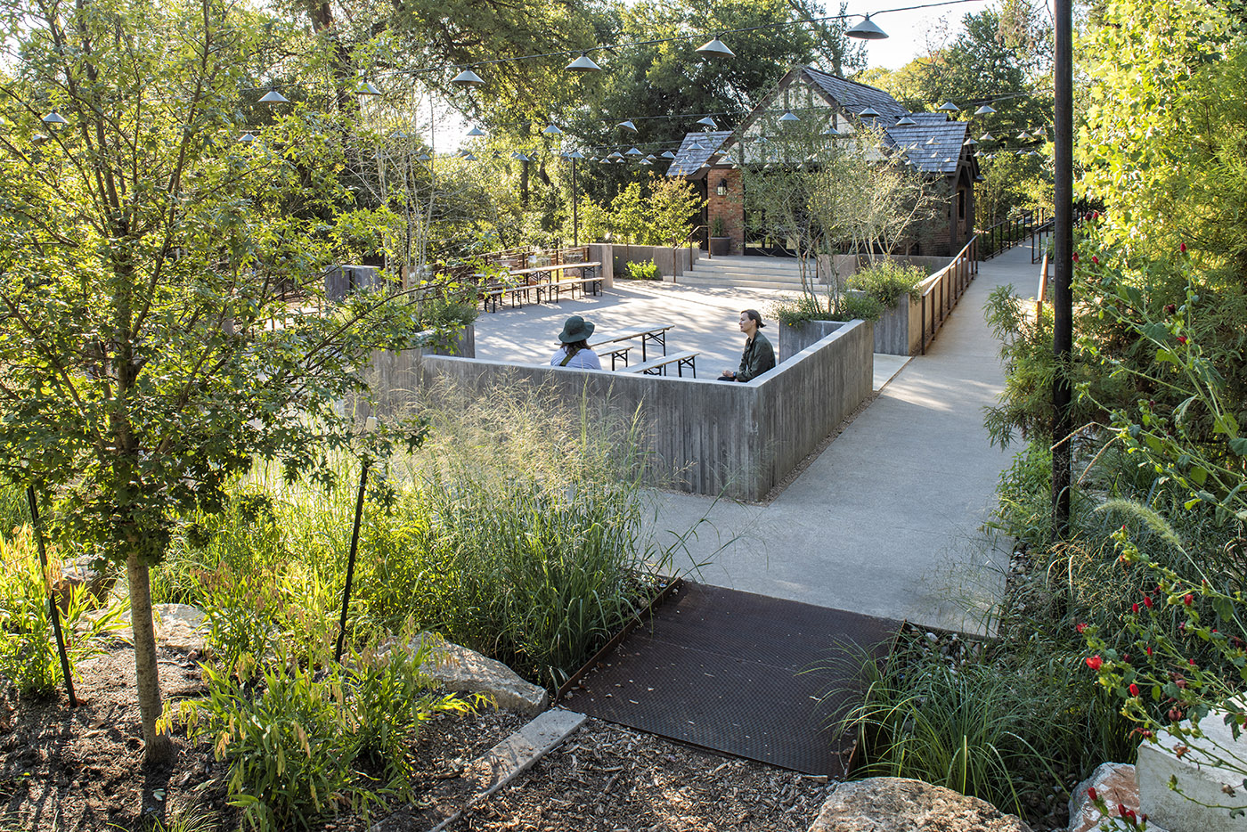 En el extremo occidental del parque, dos nuevos edificios de madera mejoran los servicios del parque. Revestidos con una malla de acero en la que puede crecer la hiedra y con una paleta de colores inspirada en el paisaje, los nuevos volúmenes de los baños y el almacén quedan relegados al fondo. Un nuevo patio adyacente al almacén forma un anfiteatro sombreado ideal para reunirse o descansar. Un nuevo muro de piedra caliza unifica visual y físicamente los distintos elementos exteriores mientras se desanuda por el parque. A medida que sube y baja de altura, el muro se transforma en una escalinata en la colina, en un banco, y hasta en una línea de color en la acera. También se transforma en la fuente de agua que refresca a los visitantes del parque en los meses de verano, destacando simbólicamente el manantial natural restaurado en la ladera de Tudor Cottage