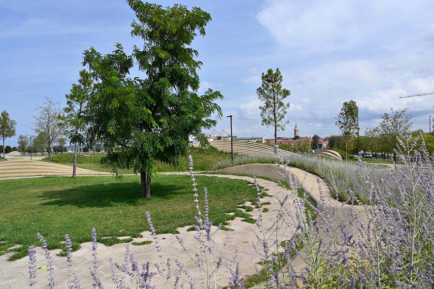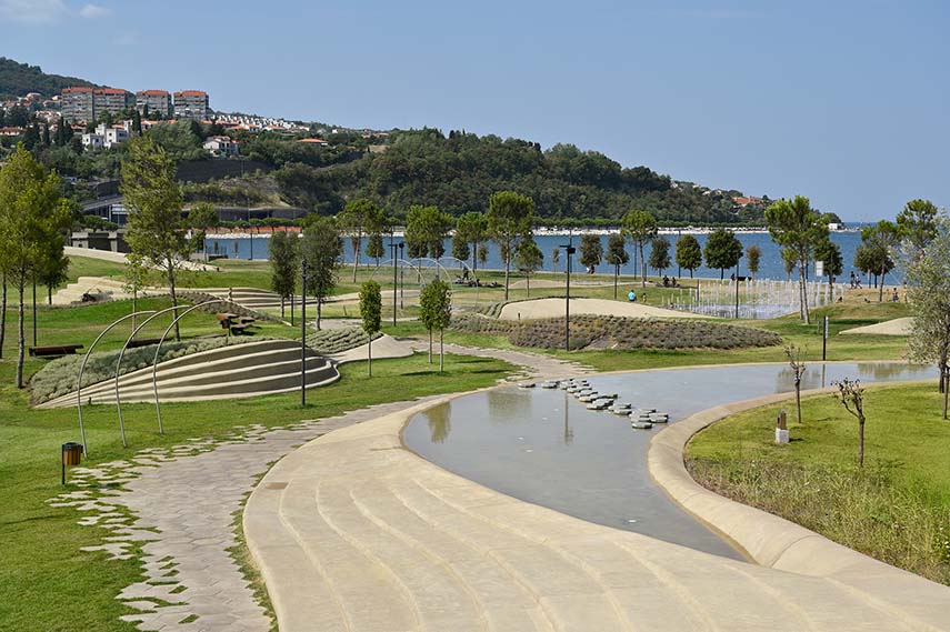 El área del nuevo Koper Central Park abarca una parte considerable del sitio y su diseño puede servir como prototipo para futuros proyectos de exteriores e intervenciones urbanísticas. El nuevo proyecto, diseñado por ENOTA, ofrece un aspecto uniforme y atractivo al área y, con su intenso entorno verde, suaviza la heterogeneidad de las estructuras construidas circundantes. La fusión de elementos de una playa urbana y un parque ciudadano contemporáneo anima a los residentes y visitantes de la zona a experimentar el espacio de diferentes maneras.