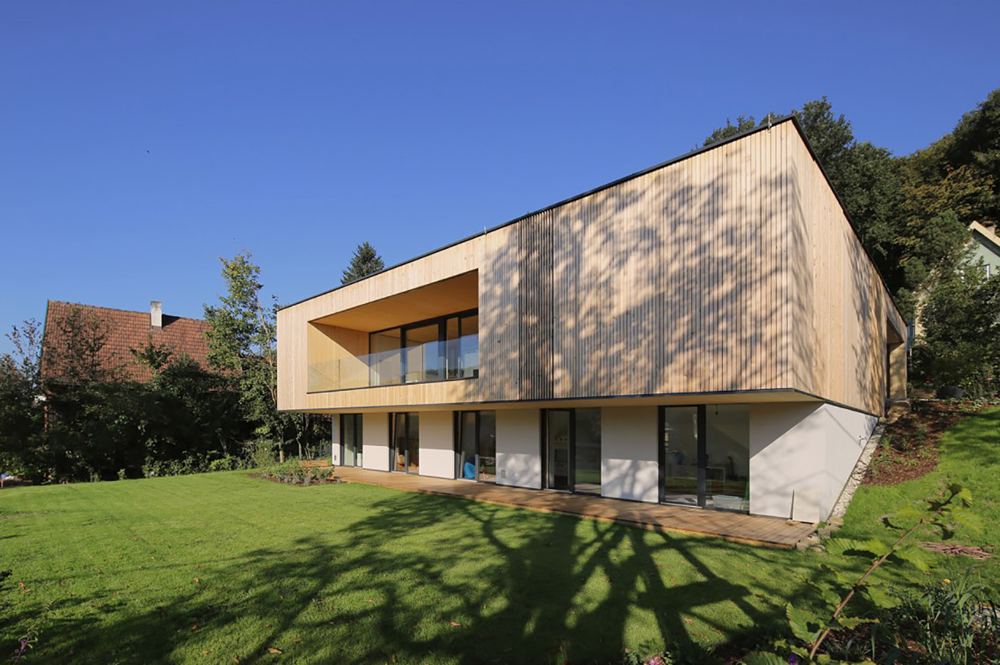 La villa encierra un patio con terraza y piscina natural en la ladera y se abre al sur a una espaciosa logia, el interior de la casa se comunica con el exterior creando una continuidad espacial. Las zonas de noche están ubicadas en la parte masiva del lado de la pendiente y también tienen una terraza cubierta con acceso al jardín