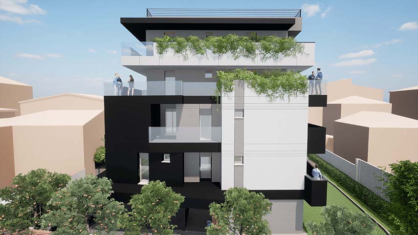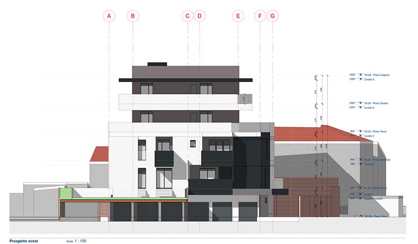GBa Studio de Gianluca Brini Arquitecto diseña el edificio residencial con 9 unidades habitacionales distribuidas del primer al cuarto piso reservando el nivel de la calle para las áreas comunes, los garajes, las salas técnicas y otros espacios accesorios. A diferencia de otros proyectos de arquitectura de este tipo, debido a la limitación del terreno no fue posible construir un sótano, pero cada acceso y recorrido del edificio está diseñado para garantizar condiciones de total "accesibilidad universal". El primer nivel superior alberga 4 apartamentos y el segundo 3, mientras que los dos últimos un único apartamento por piso.