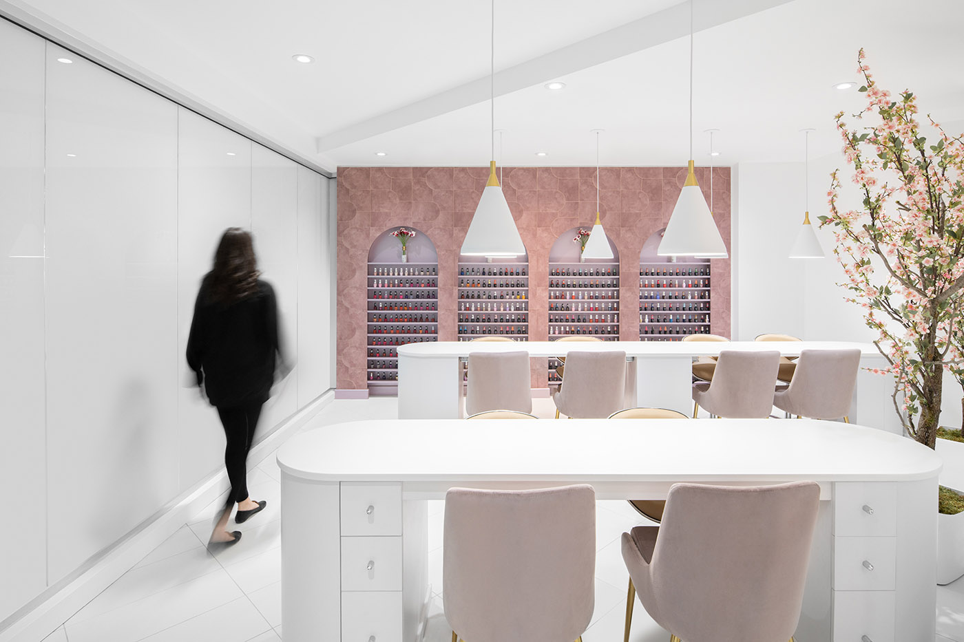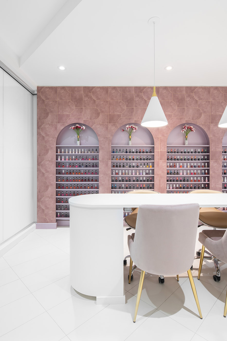 La identidad de la marca Diva Nails es el embrión del proyecto. Les Ongles Diva Nails va mucho más allá de la estética, creando un espacio que permite una mejor experiencia de usuario, así como la creación de un sentido de pertenencia para el cliente. Inspirado en la flor de loto, el proyecto se inserta en la tradición de los proyectos de diseño de interiores que ponen en el centro el bienestar y la relación con el entorno natural. A través del uso del color y de las flores, establece un fuerte vínculo con la naturaleza. En otras palabras, los modelos, las formas de los muebles, la iluminación y otros componentes del proyecto han sido cuidadosamente seleccionados en el espíritu de la biofilia.
