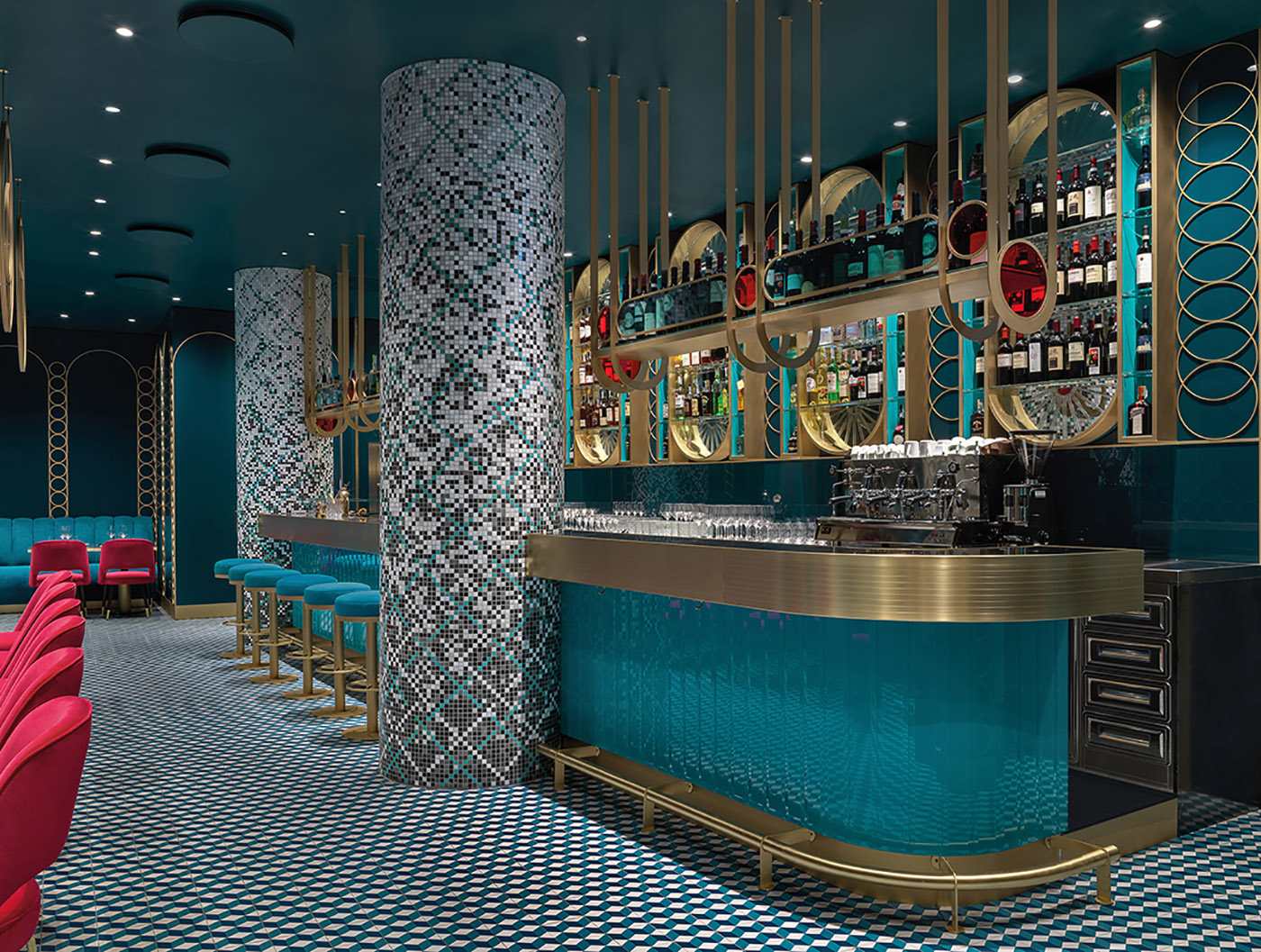 El uso de vidrios coloreados con pasta para la creación de elementos arquitectónicos decorativos es una reinterpretación contemporánea delos vidrios emplomados de principios del siglo XX; la elección de las geometrías esenciales y el uso de colores primarios se inspiran en la investigación de Wright. Las grandes columnas cubiertas de mosaico perforan el largo mostrador con su revestimiento de cristal de diamante turquesa donde, sobre una gruesa tapa de latón molido, los acrobáticos bar tender mezclan sus cócteles