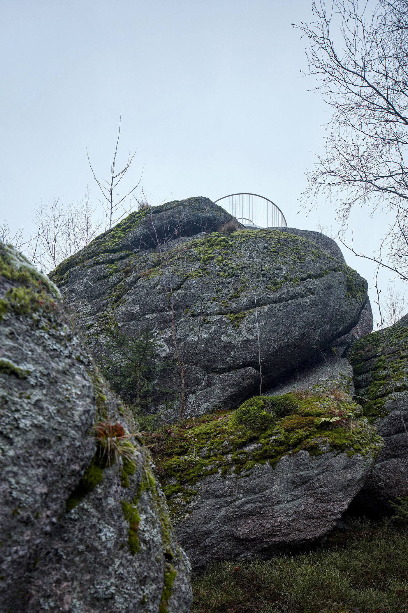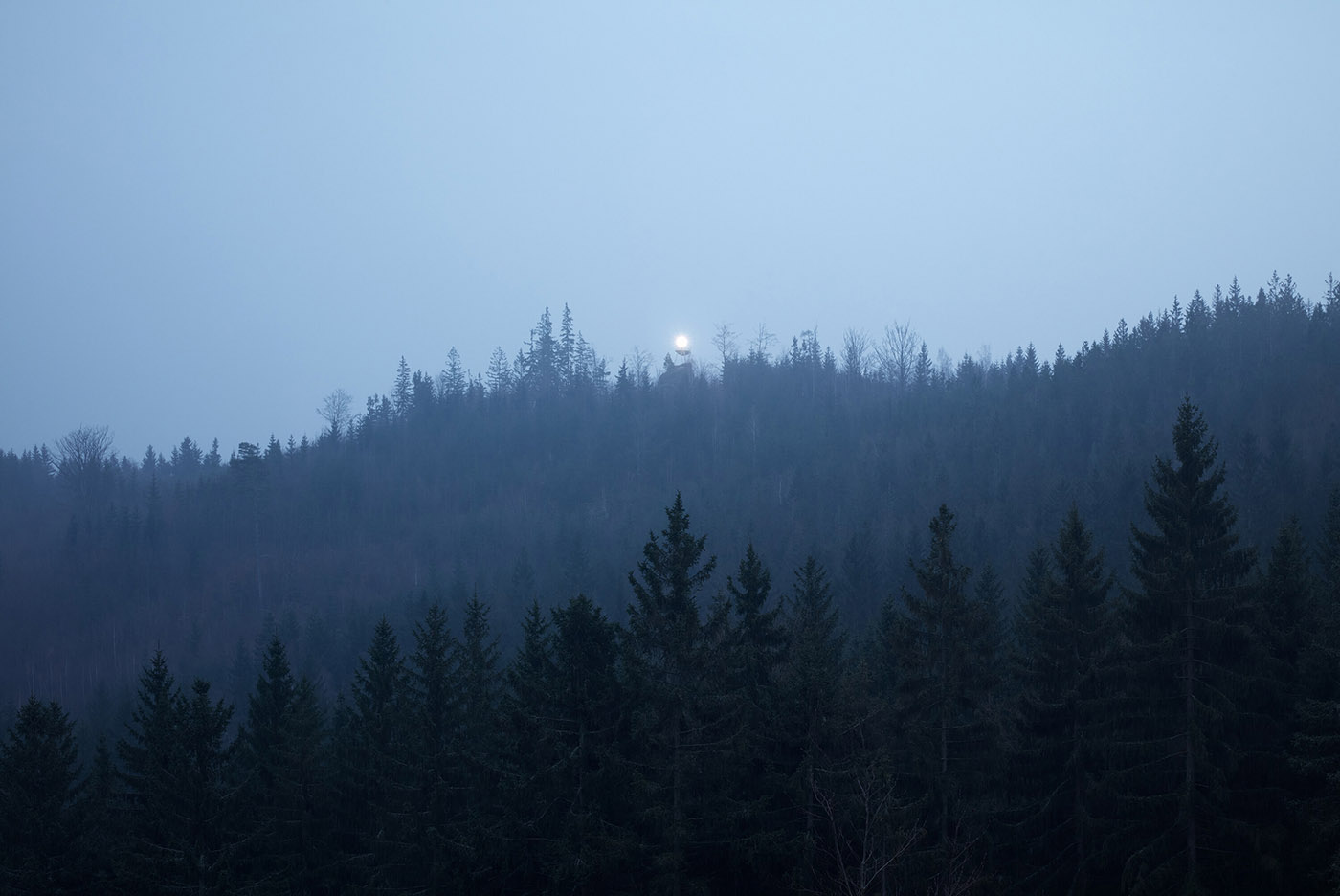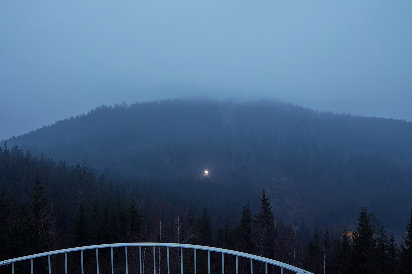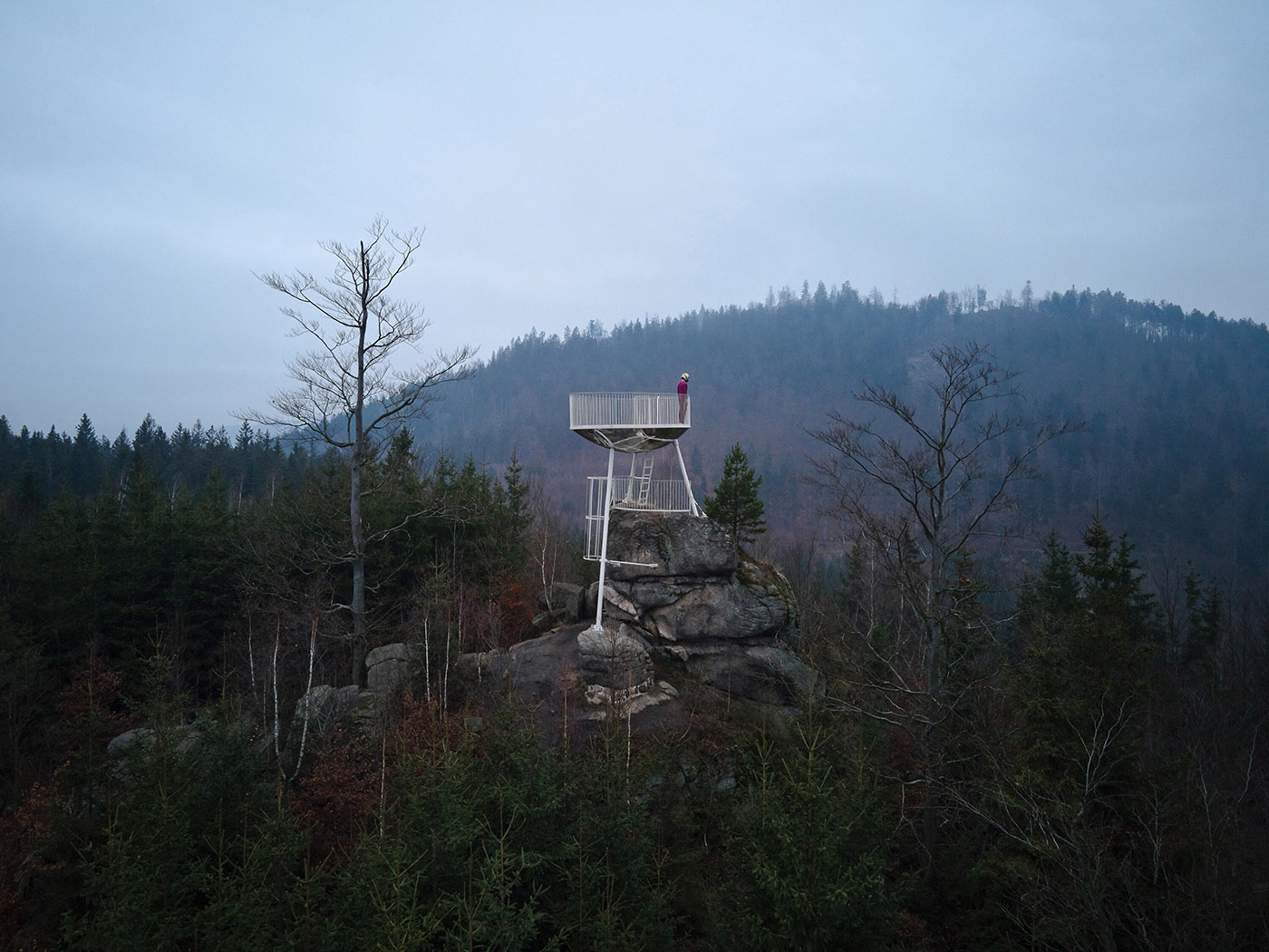 The Lookout Spike se encuentra en la cima rocosa de Malý Špičák y mira hacia el valle de la confluencia de los ríos Desná y Kamenice. El objetivo del proyecto era crear una pieza arquitectónica pequeña pero distintiva. Un edificio tan delicado y escurridizo como una gota de rocío que apenas toca la roca