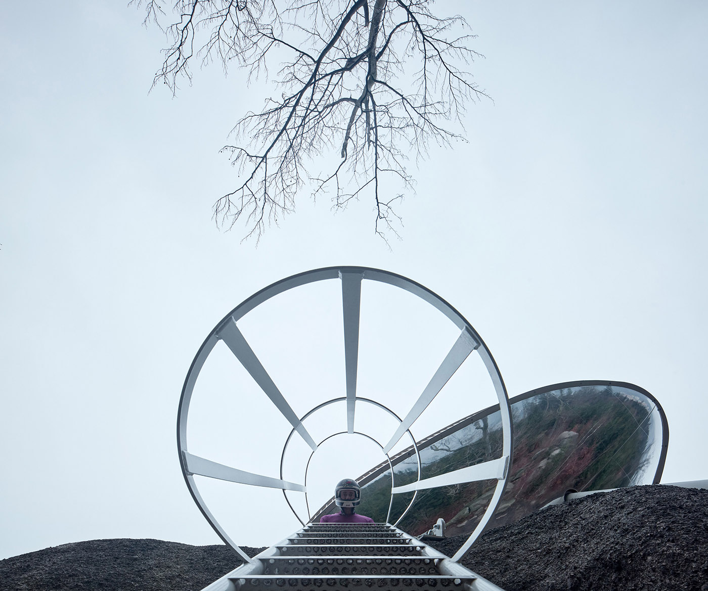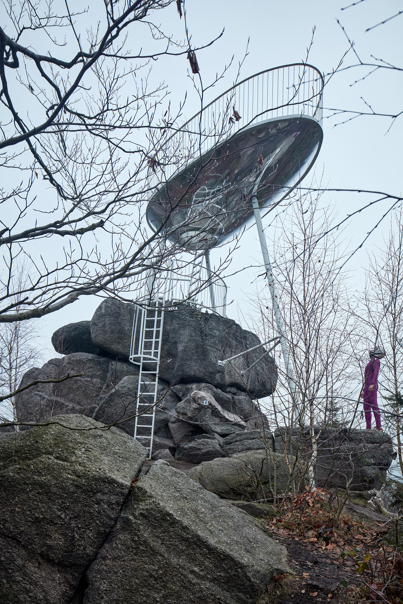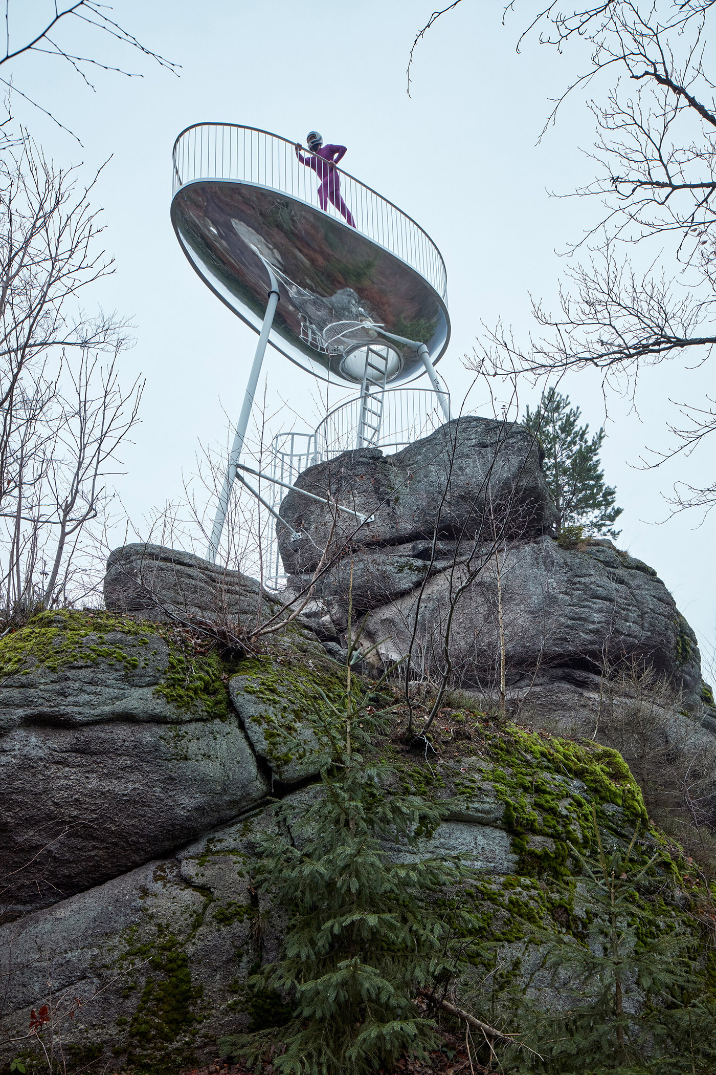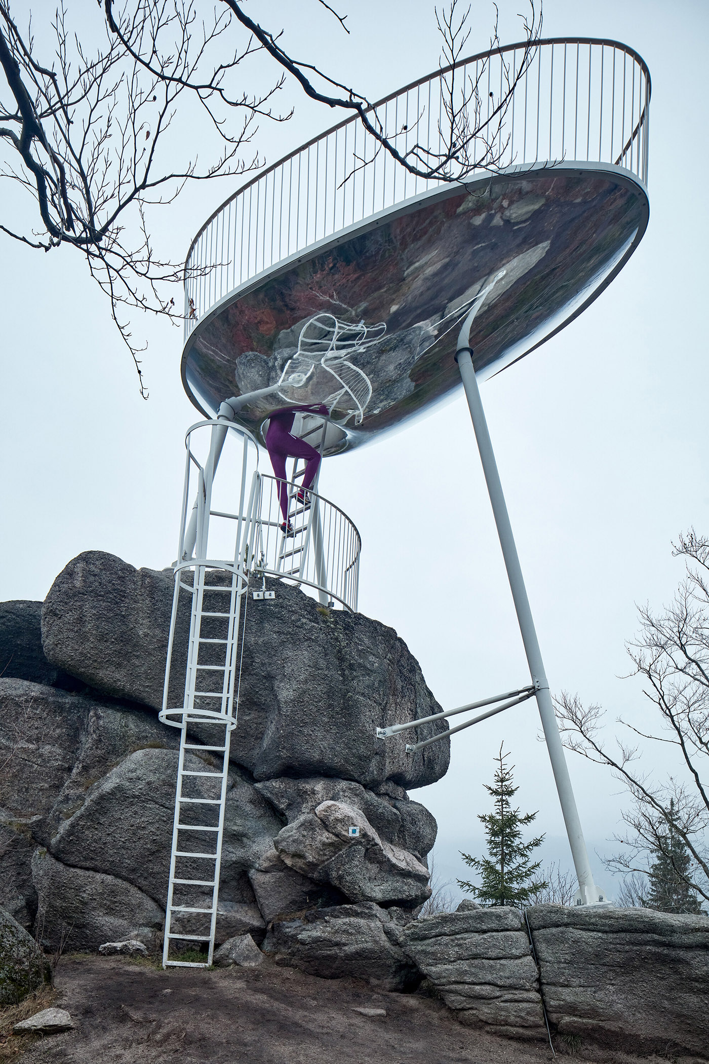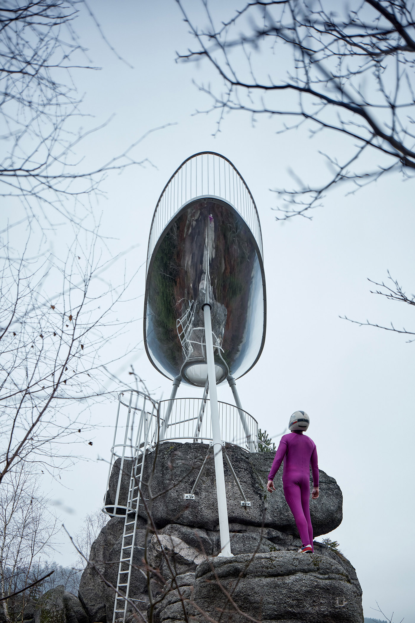 La arquitectura del mirador tiene tres finas patas de acero y un vientre brillante que refleja el granito, los árboles, la gente y el cielo. El mirador, al que se accede por una escalera, ofrece una vista de Tanvald y las montañas circundantes. La imagen reflejada en la superficie curva de abajo está distorsionada, los colores y los reflejos se confunden