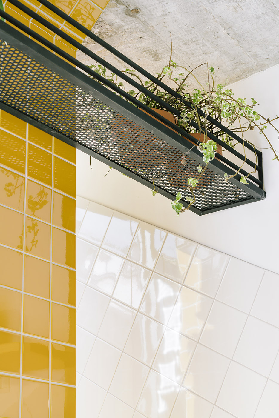El mostrador aparece como un elemento de continuidad tanto de los alzados cerámicos como de la madera. El toque de color se añade mediante el tono mostaza del azulejo. Desde el exterior, el escaparate destaca la doble altura del local; para llenar la parte superior se decoró el espacio con amenas plantas. La sensación de altura se refuerza gracias al pilar que comparte el color mostaza con el mostrador