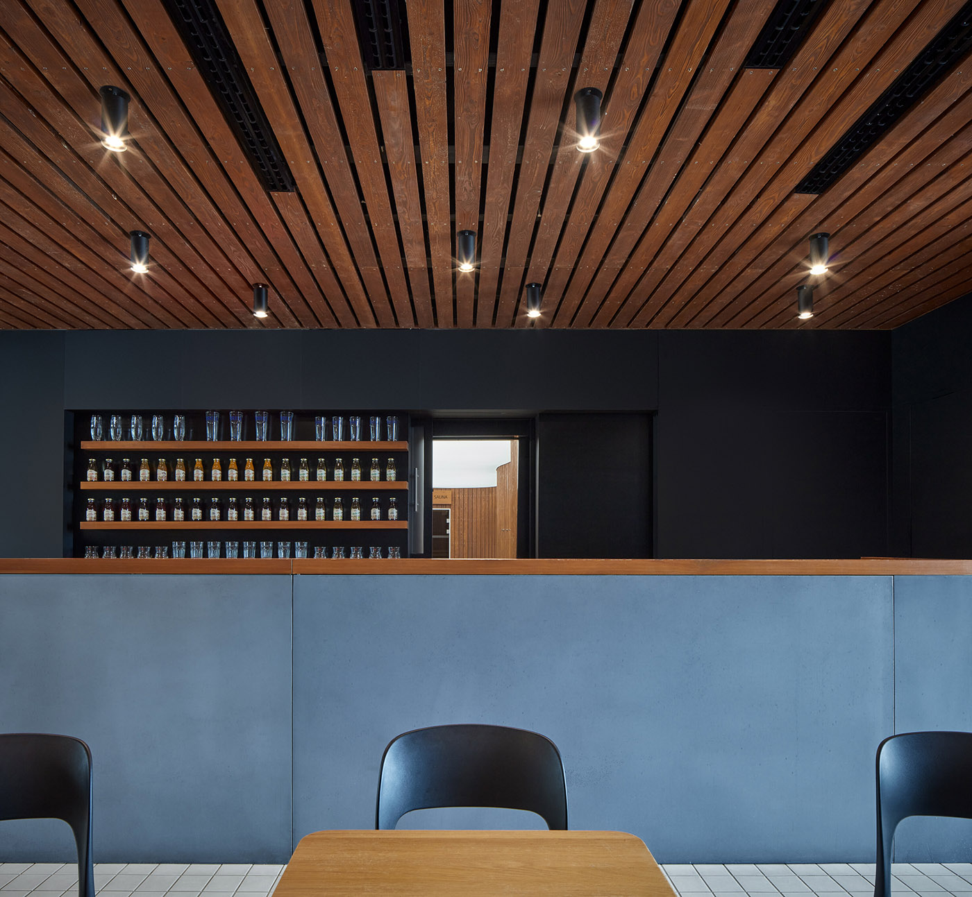 Su forma dinámica comunica y revela a través de una pared de cristal el mundo que encierra en su interior. El excepcional voladizo de la superficie del techo inclinado con la hilera cortante de las fachadas laterales separa dos mundos que, aunque en contraste, coexisten: uno, el interior de la piscina, teñido de azul y madera donde las personas están en traje de baño y el otro, exterior, donde los transeúntes vestidos con cálidas prendas de invierno miran temblando a los bañistas.