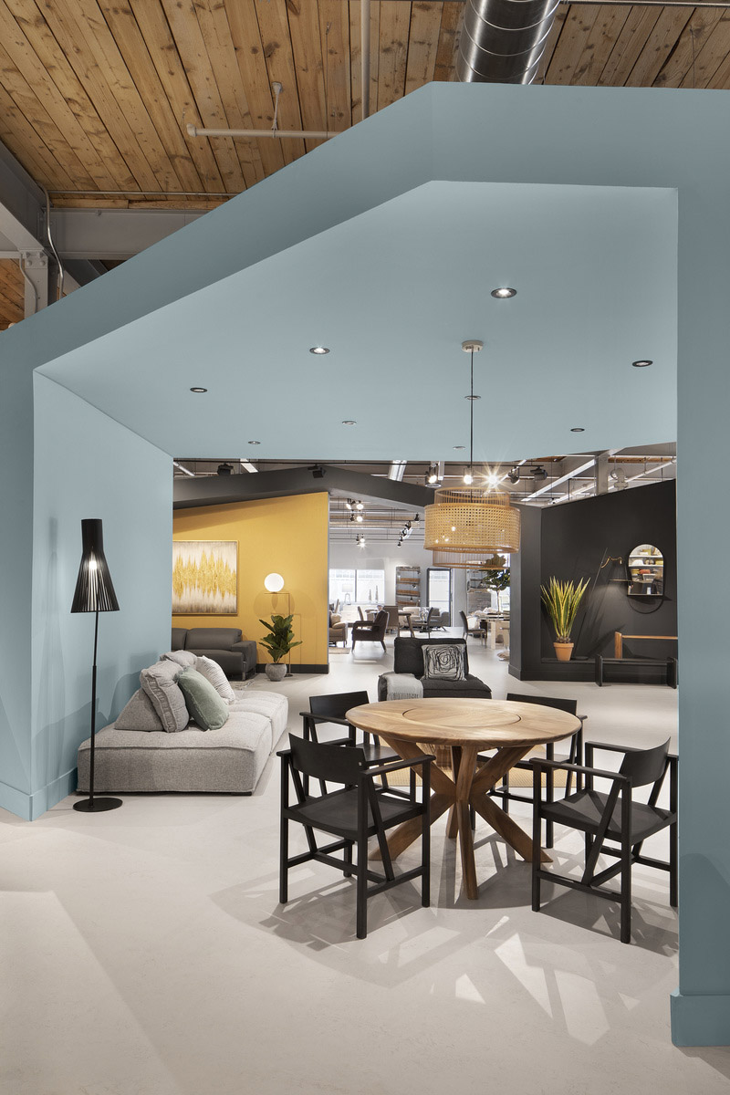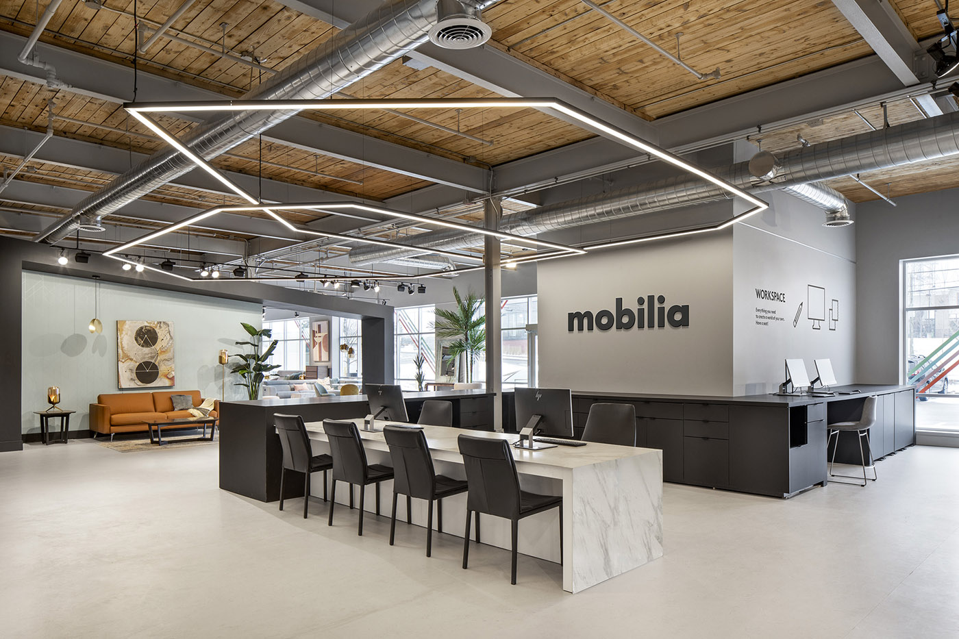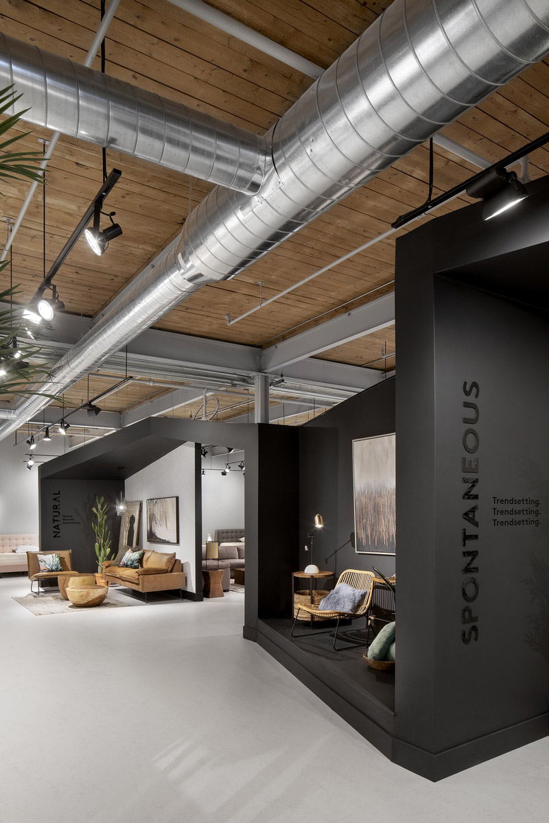 Mobilia y MXMA Architecture & Design, un estudio de arquitectura especializado en proyectos de diseño de interiores también para espacios comerciales, colaboran para crear una tienda que exhibe los muebles modernos de la empresa. El objetivo principal es ofrecer una experiencia de compras completamente nueva. En el lado derecho de la nave central, una estructura arquitectónica negra divide el espacio, y sus ángulos sirven como entrada a los 4 mundos al estilo de Mobilia: Wow, Natural, Euro y Spontaneous, cuatro áreas distintas donde navegar libremente en busca de tu personalidad.