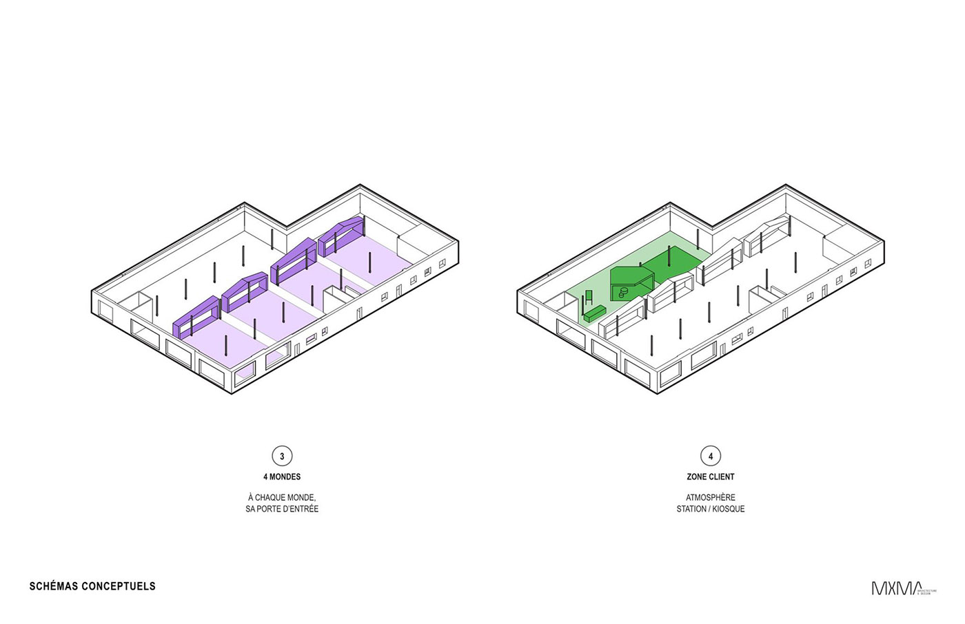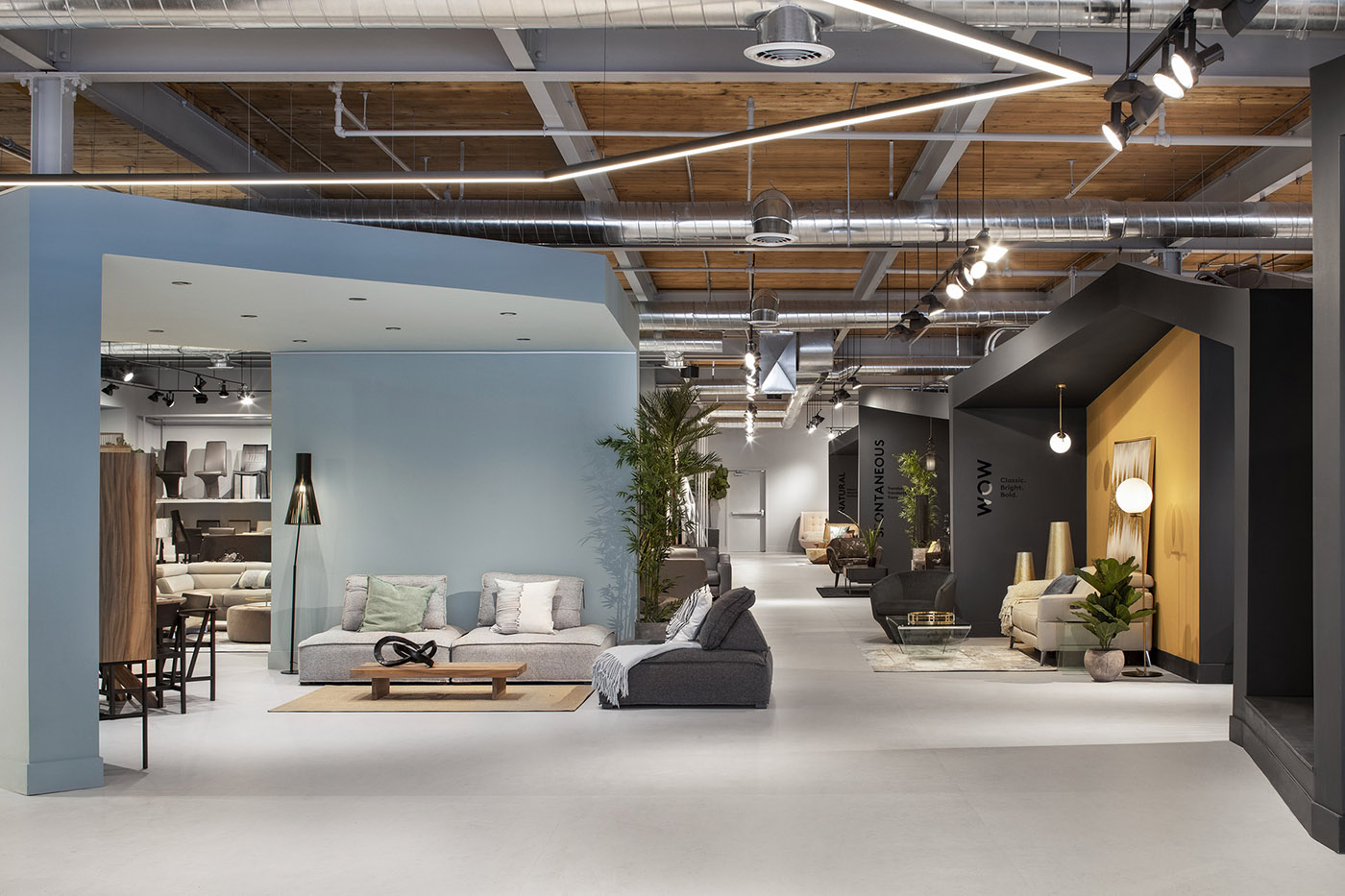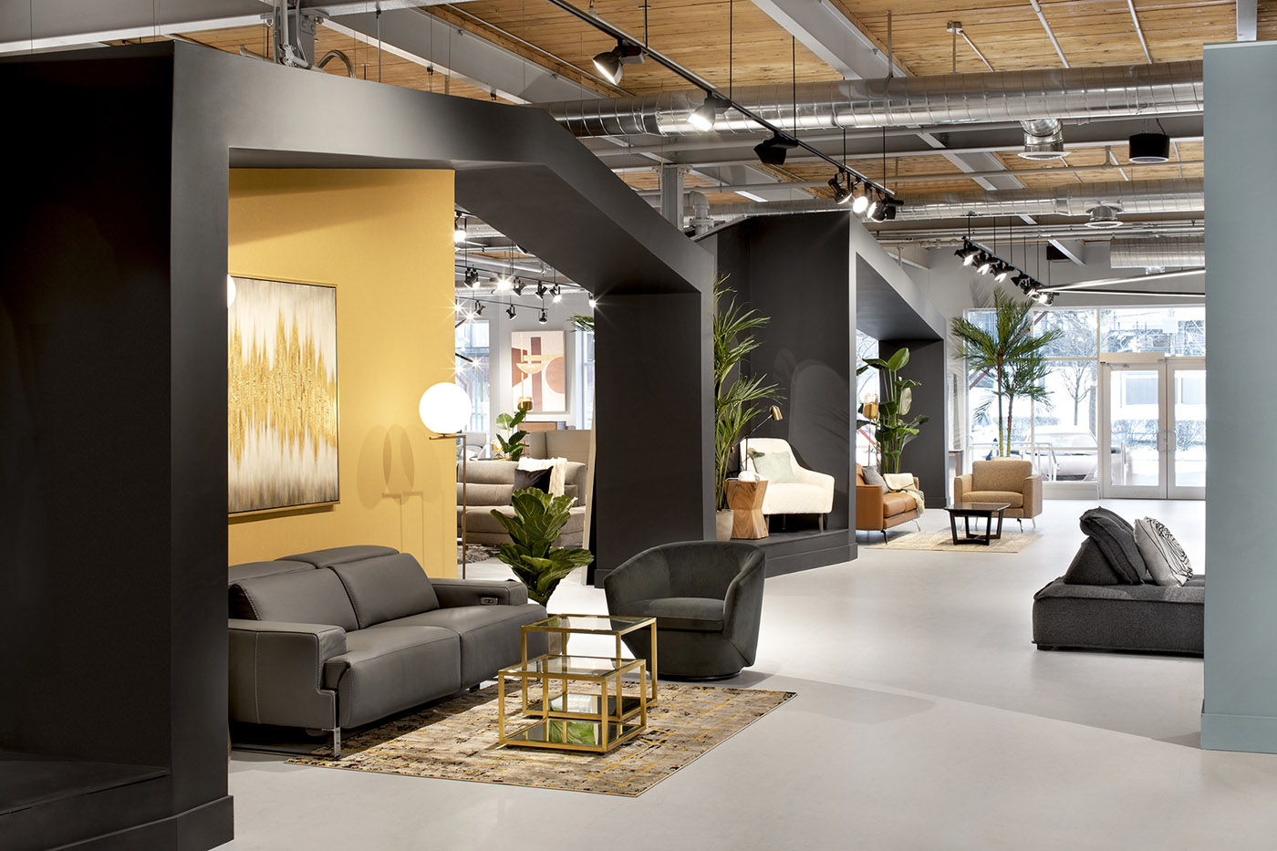 Mobilia y MXMA Architecture & Design, un estudio de arquitectura especializado en proyectos de diseño de interiores también para espacios comerciales, colaboran para crear una tienda que exhibe los muebles modernos de la empresa. El objetivo principal es ofrecer una experiencia de compras completamente nueva. En el lado derecho de la nave central, una estructura arquitectónica negra divide el espacio, y sus ángulos sirven como entrada a los 4 mundos al estilo de Mobilia: Wow, Natural, Euro y Spontaneous, cuatro áreas distintas donde navegar libremente en busca de tu personalidad.