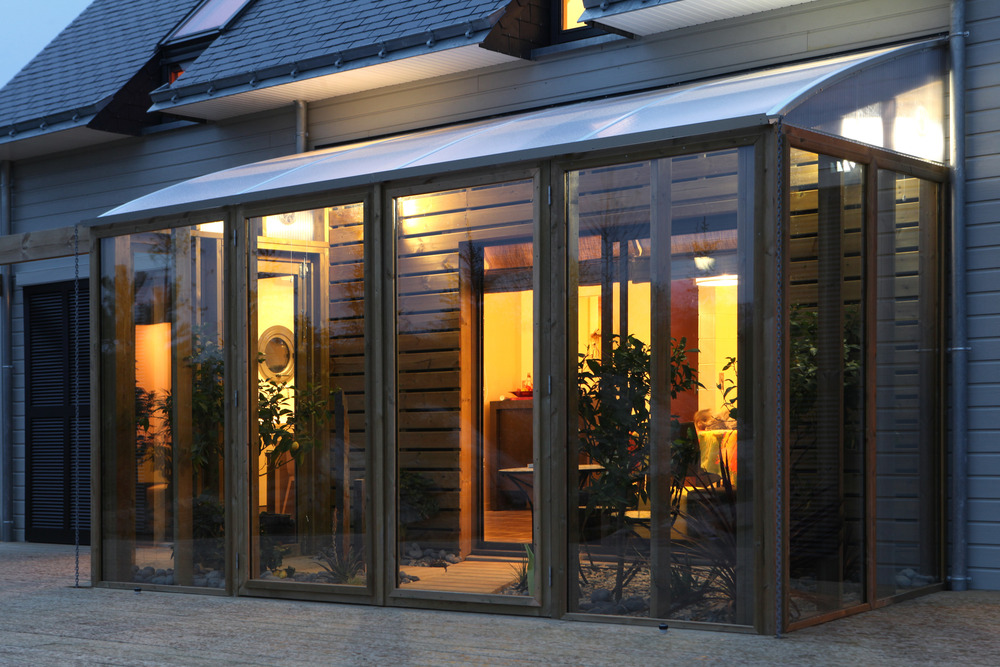 Frente a la piscina, una pérgola de glicinias forma una conexión entre la cocina, la terraza y un jardín de invierno con estructura de madera con techo de policarbonato, doble acristalamiento y subestructura de madera, que alberga un jardín de invierno. El jardín de invierno con sus persianas correderas de listones de madera y el jardín de invierno hecho de piedras, pizarras y arbustos rotos está diseñado para proporcionar calor adicional en invierno y permanecer abierto en verano, asegurando así una ventilación natural para la casa