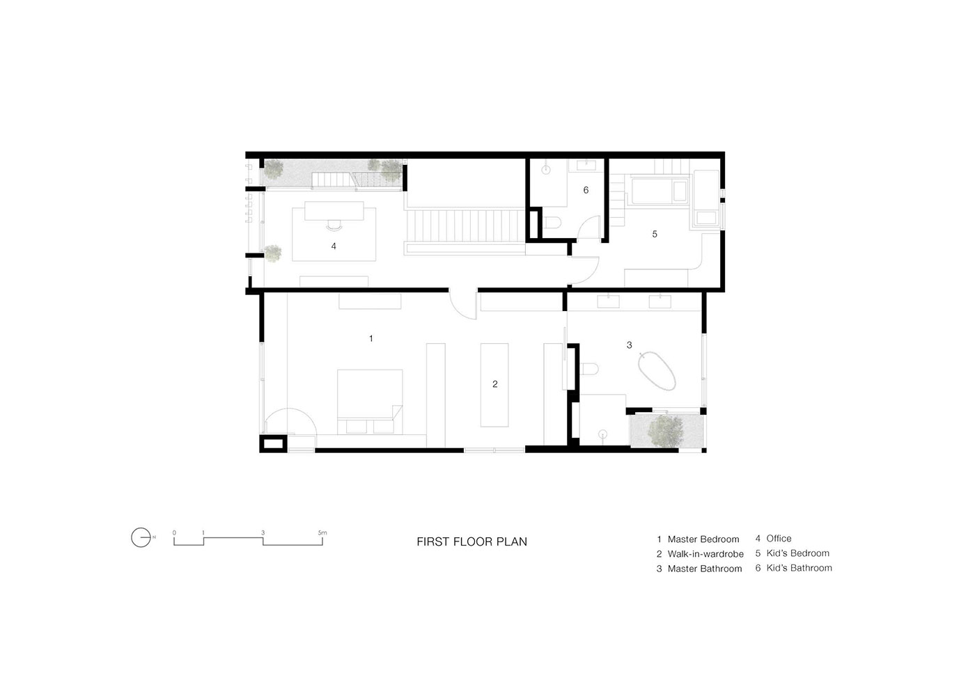 La continuidad del material también se lleva al entrepiso con la adición de una galería que extiende el piso existente y envuelve la periferia de los espacios habitables de doble volumen. Este espacio actúa como una pasarela equipada con estantes y armarios de almacenaje, iluminada por los ventanales altos. Al final de la galería, hay una zona de día/estudio que flota y proyecta la mirada hacia las copas de los árboles. El jardín se ha transformado en un jardín de rocas esculpidas que ofrece un refugio tranquilo