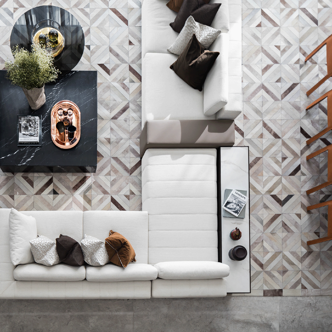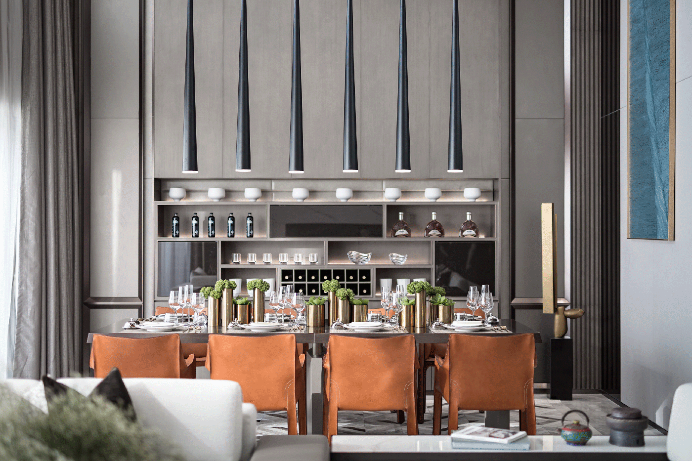 El salón principal da hacia el comedor, que está hecho de chapa de madera para crear una sensación de calidez. La pared de mármol natural, pues, caracteriza el espacio y satisface las necesidades del propietario de crear un lugar acogedor para entretener y socializar