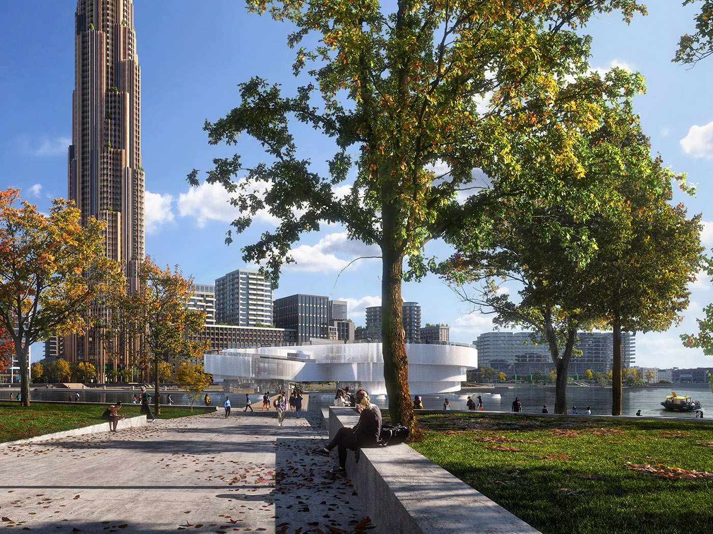 El centro conectará con la ruta a lo largo de los muelles de Rijnhaven y con los diversos senderos previstos en el agua. Estando una parte del edificio bajo el agua, el proyecto no es demasiado grande en términos de tamaño y escala en comparación con el puerto, excepto en la marea baja, cuando la parte sumergida también se hace visible