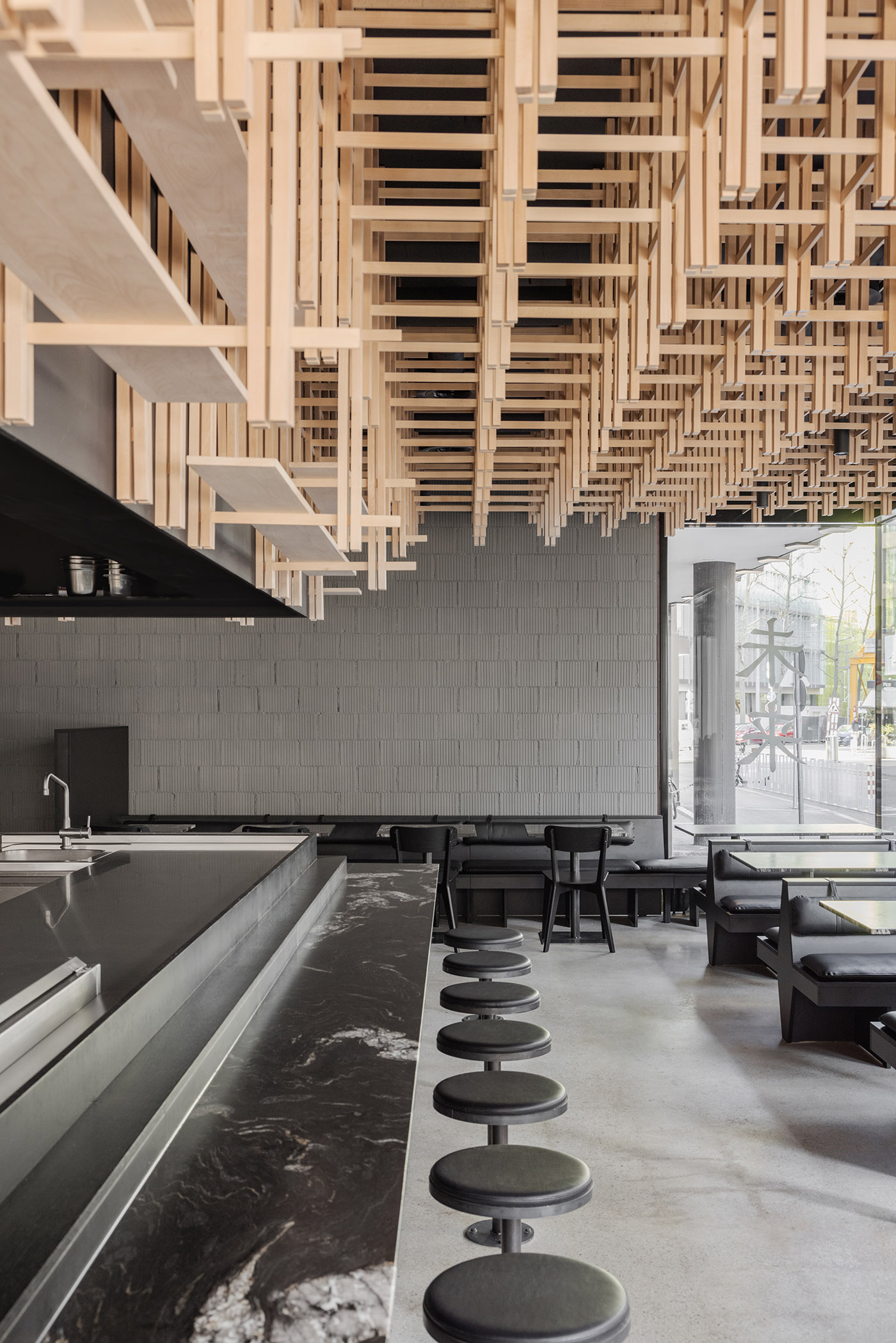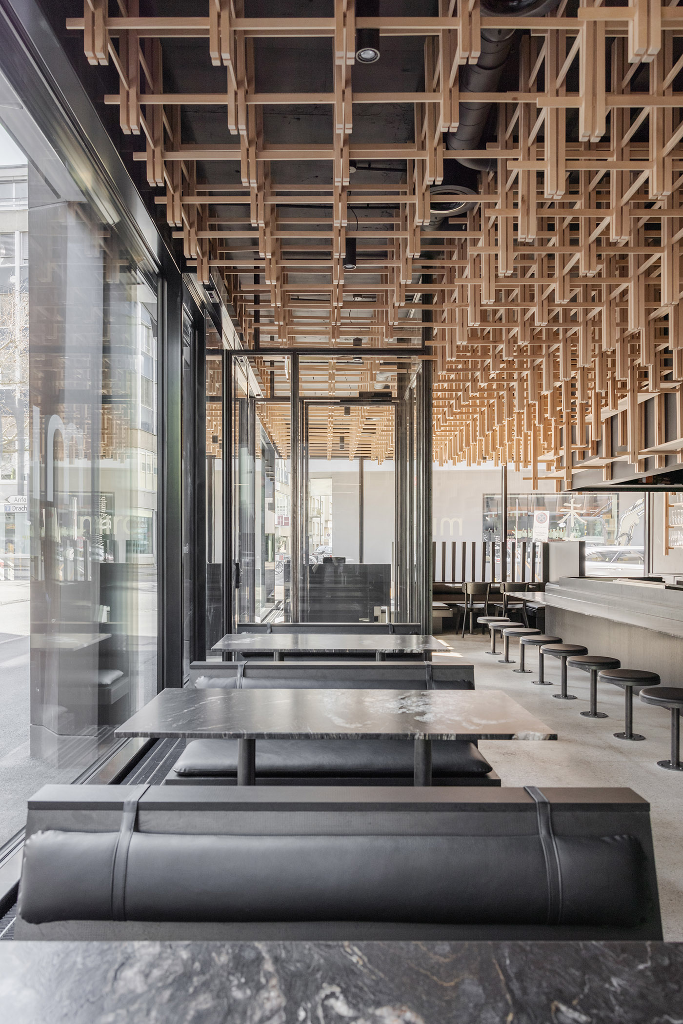 El diseño de KOHLERSTRAUMANN para el Ramenclub toma influencias de todo el mundo: el Mirai se abre de par en par, cincelado en tonos negros y grises. "La piedra en bruto, el metal y la madera son los materiales clave para el diseño minimalista", dicen los diseñadores. A través del diseño detallado de este interior, se quiere facilitar una relación cercana entre chefs y comensales
