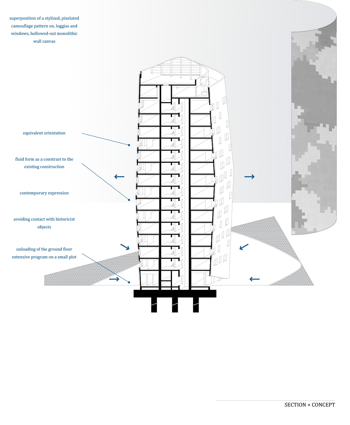 Los impulsos del diseño eran realizar un gran número de unidades residenciales con servicios anexos en un solar muy pequeño y dar un impulso y un nuevo signo al centro histórico de la ciudad. Para cumplir el primer criterio, solo podían pensar en un edificio con un desarrollo vertical, que además permitiera aprovechar el espacio restante fuera de la plaza urbana. Para el segundo, los arquitectos inventaron una estética que contrastaba con la tradicional