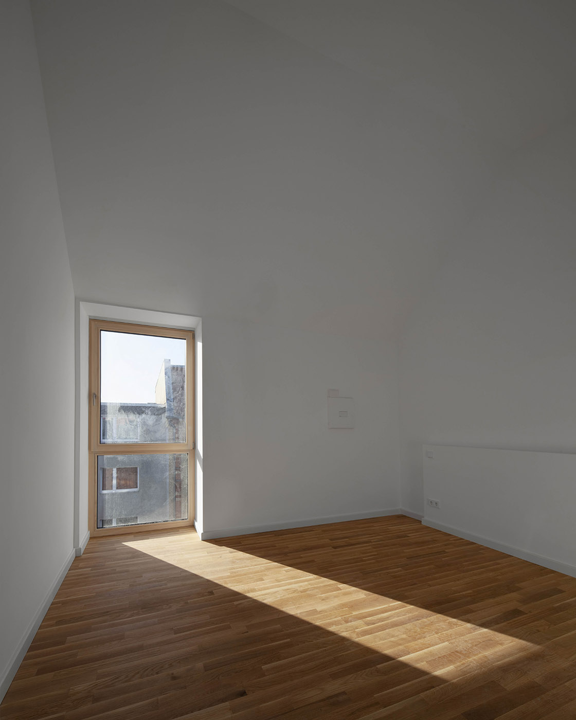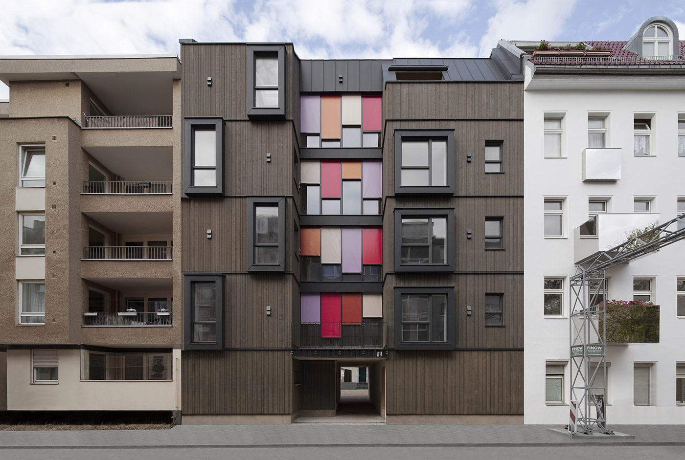Il nuovo edificio si compone di cinque livelli, due unità per livello: uno studio + un’unità di 2 camere da letto che possono essere facilmente combinati in un'unica unità o divisi in 3 unità più piccole. Il profilo del tetto replica la condizione esistente degli edifici vicini. All’interno dell’edificio i solai sono realizzati con legno visibile nella parte inferiore in modo che il residente possa percepire il metodo di costruzione sostenibile e apprezzare l’atmosfera calda che crea il legno