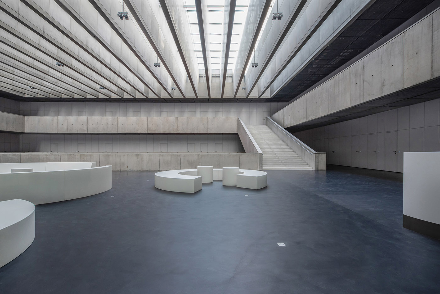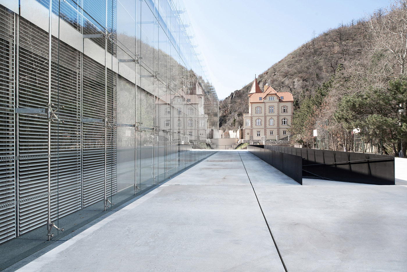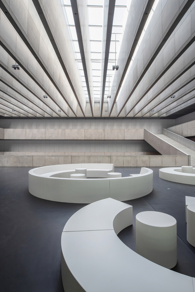 Los materiales que predominan en el interior son el hormigón expuesto combinado con una fina malla metálica en el techo, un pavimento negro y elementos de madera blanca. El espacio está dominado por una serie de muebles de color naranja. La estructura de cristales exteriores está concebida principalmente como una protección acústica eficaz contra el ruido de una autopista de circunvalación de seis carriles en los alrededores del edificio. La fachada de doble ingreso garantiza la ventilación natural y una sombra moderada del espacio interior. Las esquinas de cristal redondeadas son un vínculo con la arquitectura original