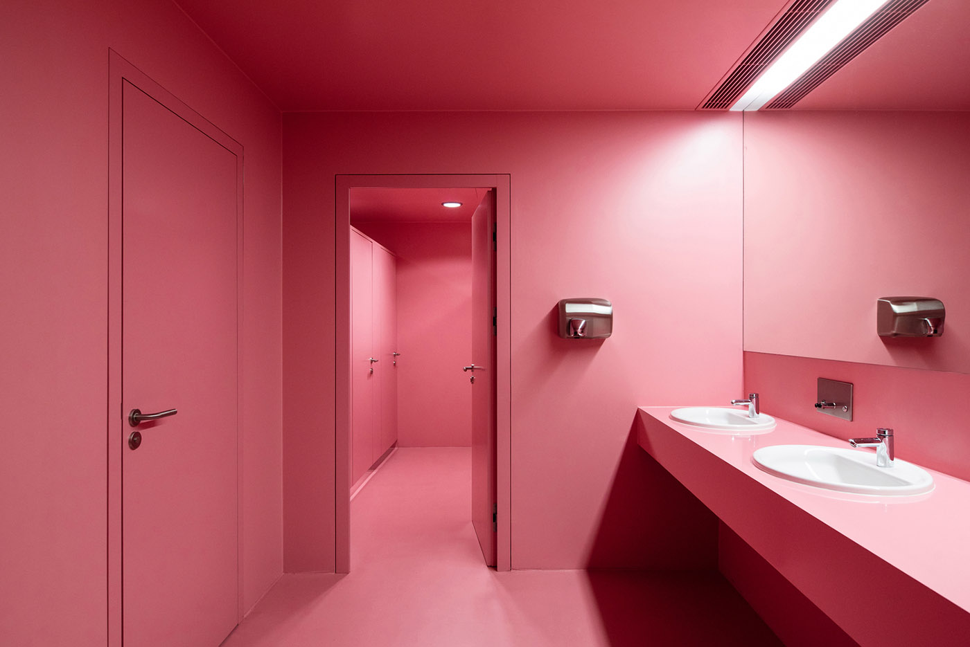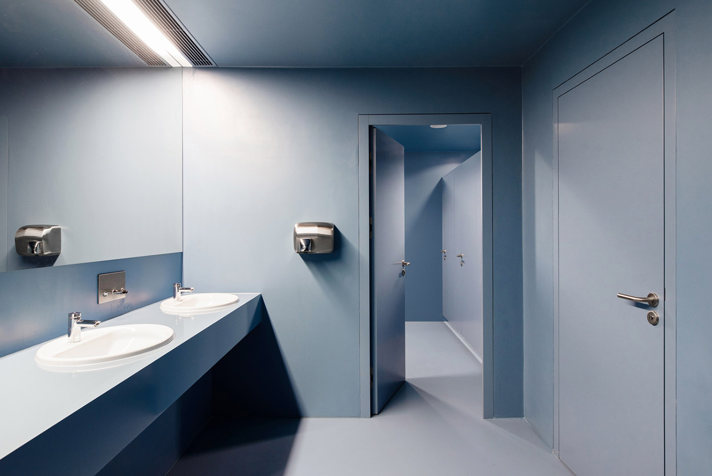 La principal intervención es la creación de un generoso vestíbulo central, iluminado desde arriba, con la luz del día que entra entre las cerchas del lucernario. El vestíbulo es el corazón y el centro social de la facultad, que une espacialmente las tres plantas del edificio: la entrada permite una sencilla conexión de todas las plantas mediante dos escaleras individuales de formas diferentes. Las galerías en voladizo que rodean el perímetro del vestíbulo dan acceso a las salas de seminarios, a los despachos de los profesores y a dos ascensores con escalera de incendios. El nivel inferior del vestíbulo alberga grandes salas comunes, el auditorio, la biblioteca de la facultad y el decanato
