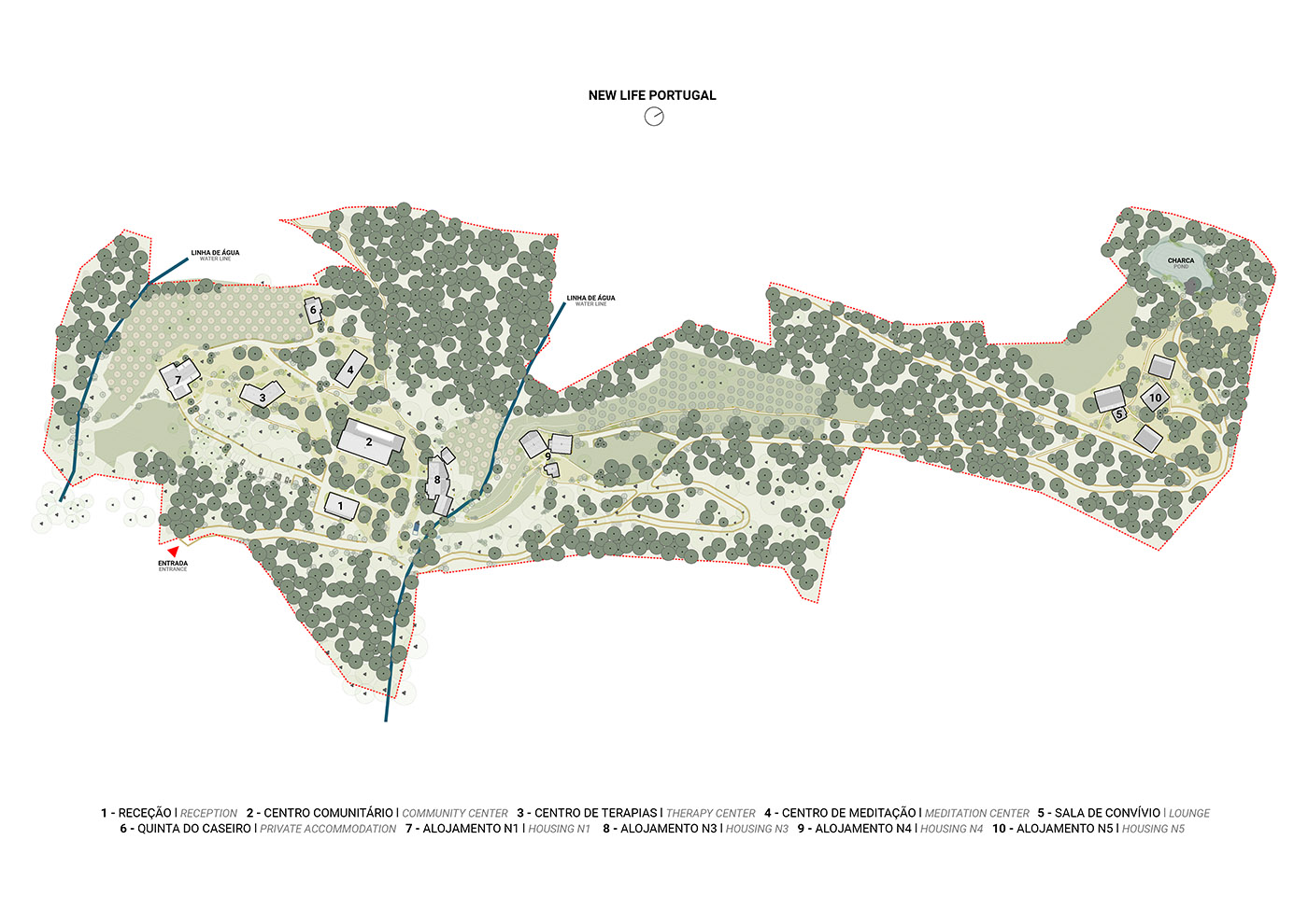 La propiedad seleccionada para la creación del centro de bienestar incluía edificios preexistentes. Al restaurar estos, fue posible desarrollar el proyecto a pesar de las estrictas restricciones impuestas por el área protegida. New Life Portugal quiso aprovechar al máximo las excelentes condiciones de la estructura para ofrecer espacios para meditación, yoga, asesoramiento, coaching, fitness y mindfulness en conexión con la naturaleza.