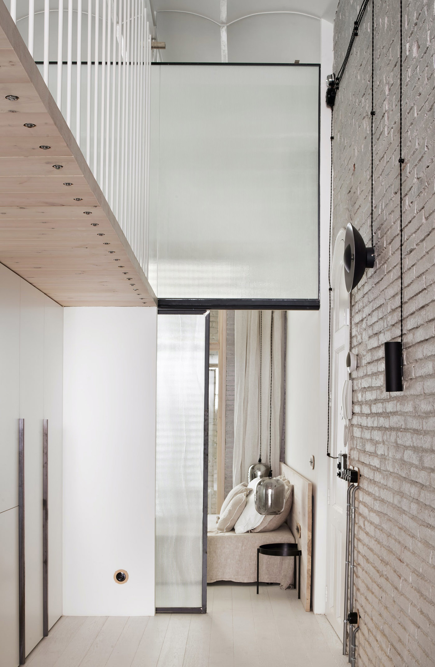 La distribución interna original presentaba altillos y vacíos en suspensión; el proyecto de Albareda aprovecha esta conformación para crear un espacio articulado y original que aprovecha las grandes alturas internas. Con el nuevo diseño, los suelos de madera de pino se extienden por el espacio para convertirse en mobiliario: mesa, luminarias...