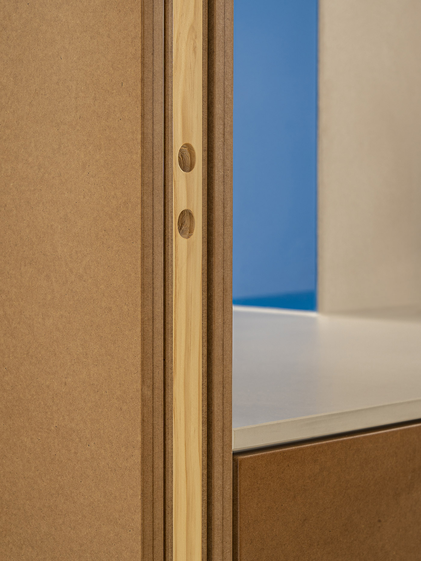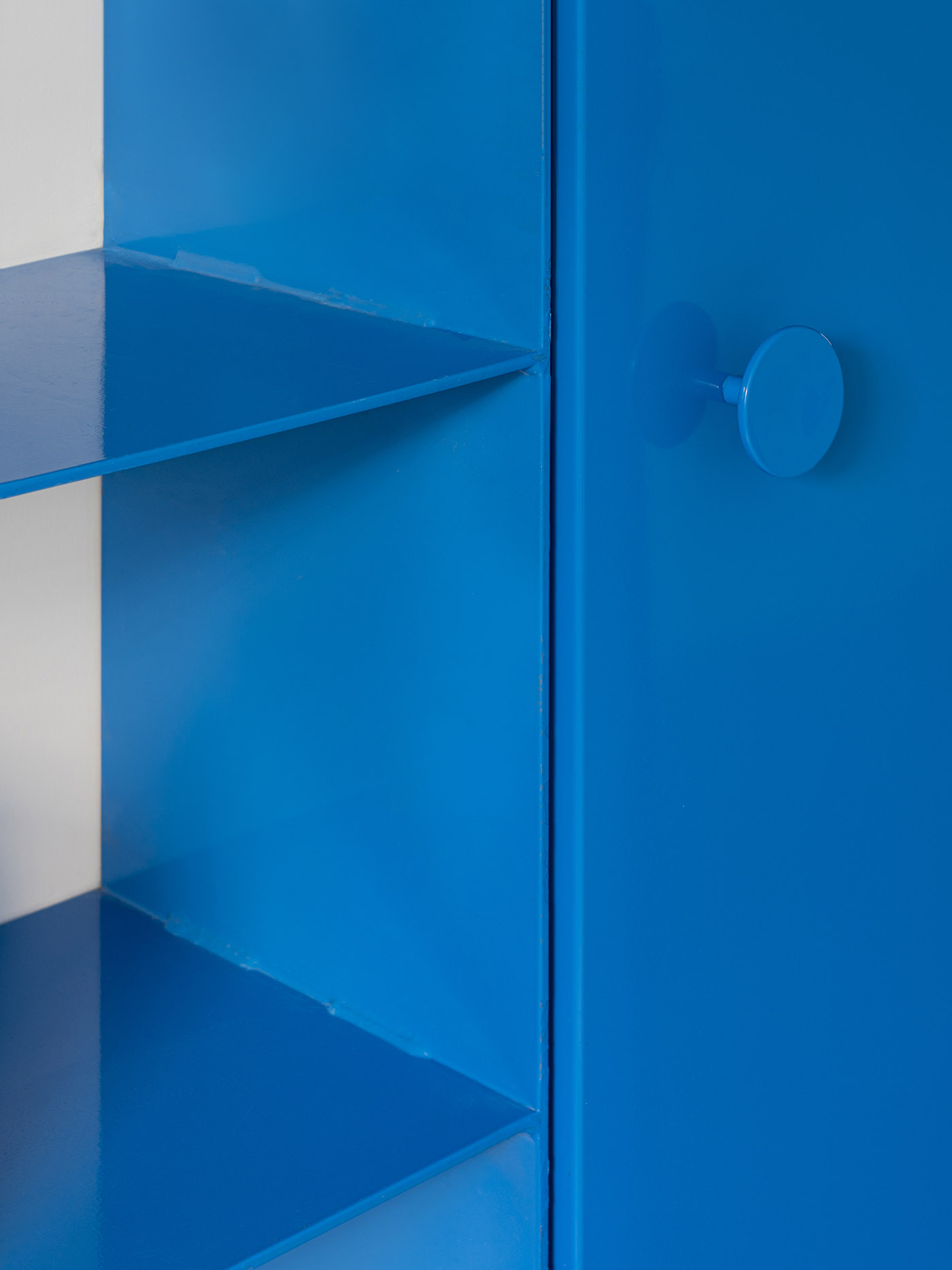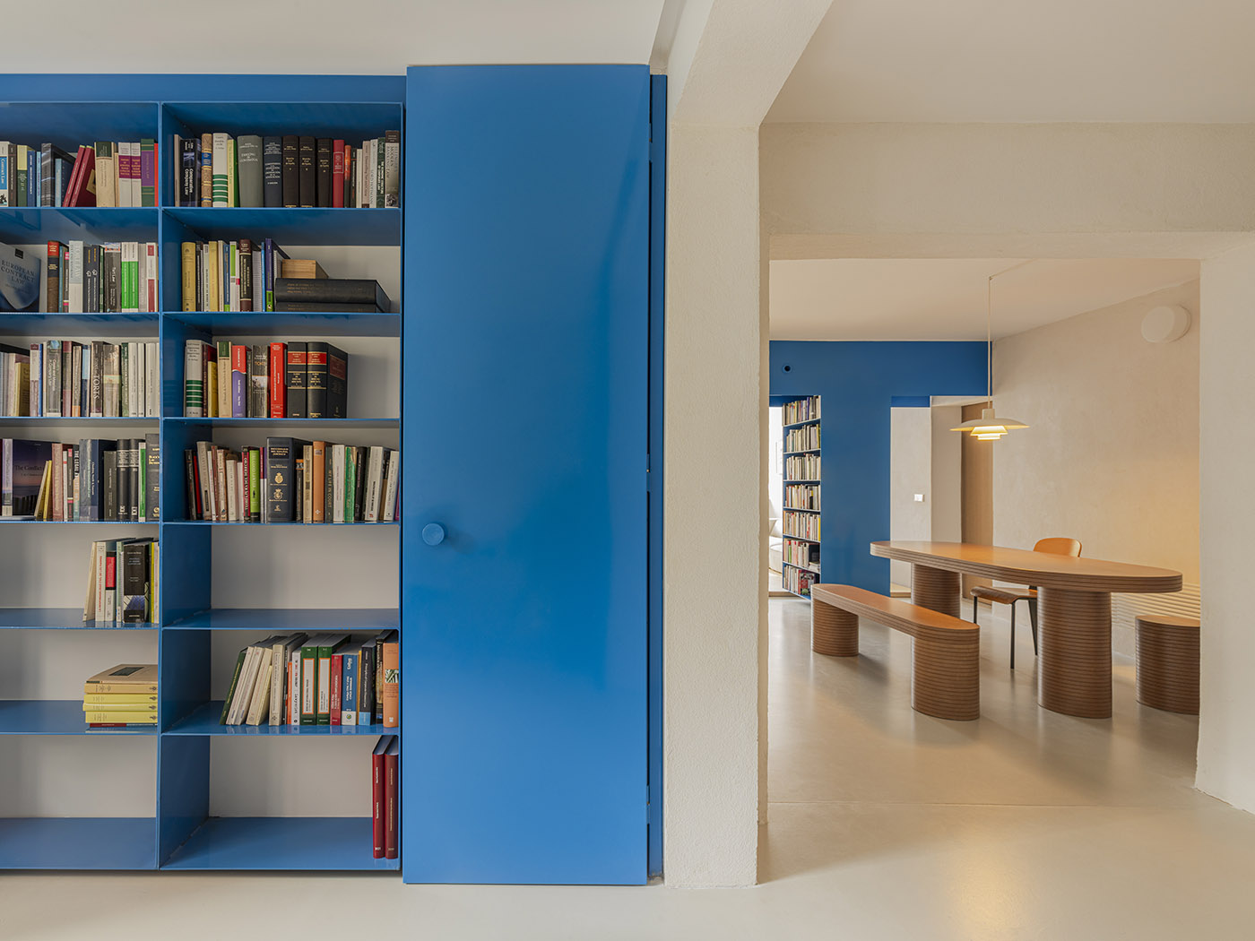 Los objetos que enriquecen el proyecto se dividen en dos grandes familias, que se distinguen por su materialidad: madera o metal. Los elementos metálicos pintados de azul cuelgan estructuralmente de las paredes, sin tocar el suelo. El elemento principal es una librería metálica en forma de "T" situada en el centro de la casa, suspendida a pocos centímetros del suelo entre los muros de carga del edificio