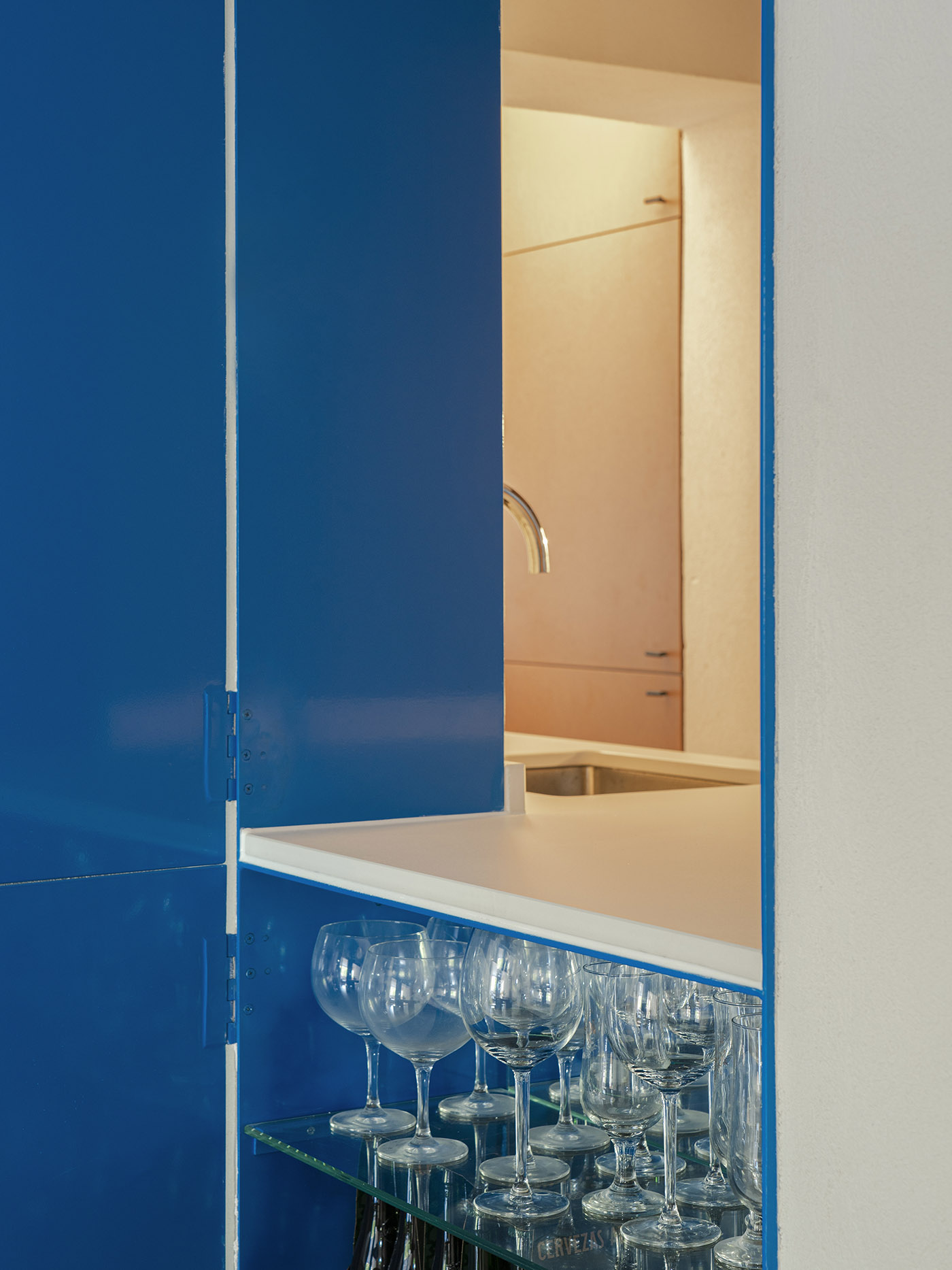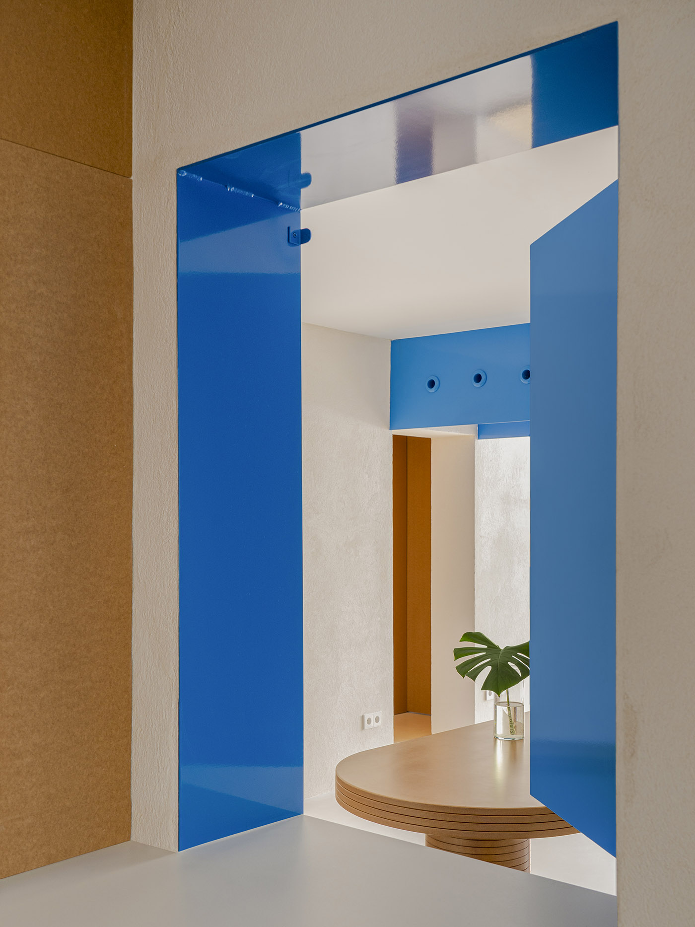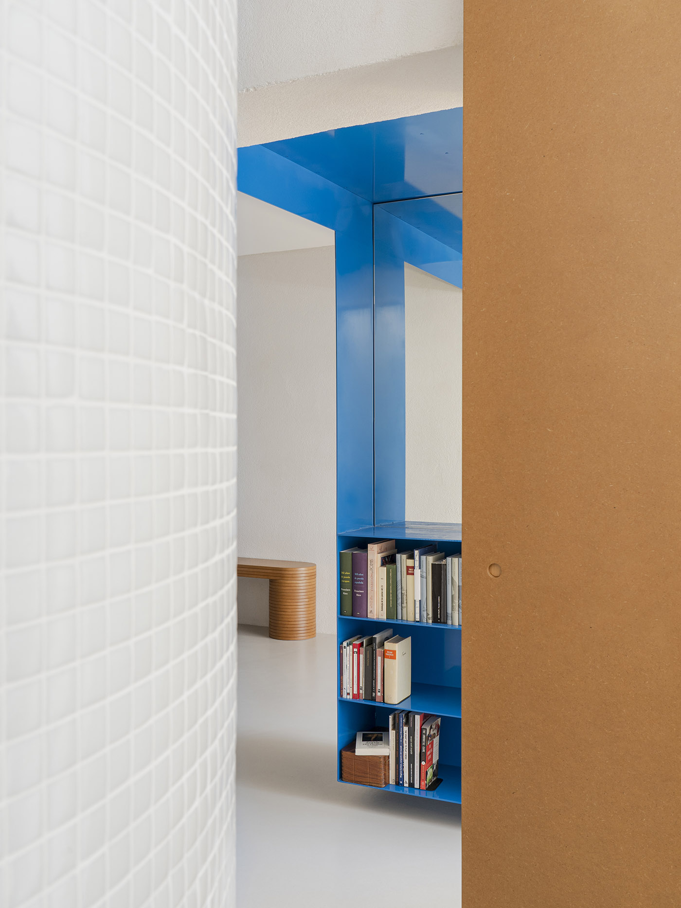 ¿Pueden unos simples muebles convertir una oficina en un hogar? Es el caso del proyecto NN06, una antigua oficina en Madrid, transformada por objetos metálicos suspendidos de color azul y muebles de madera