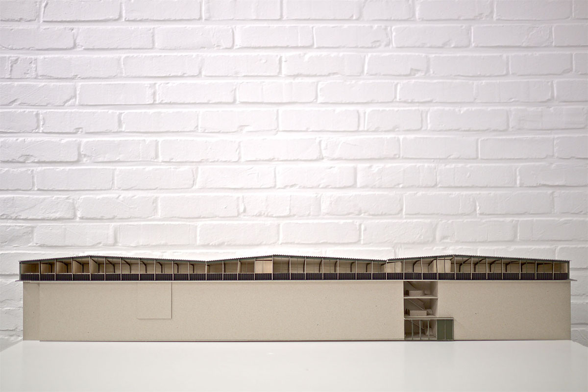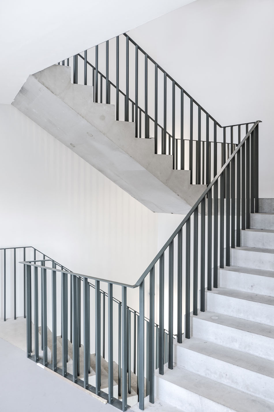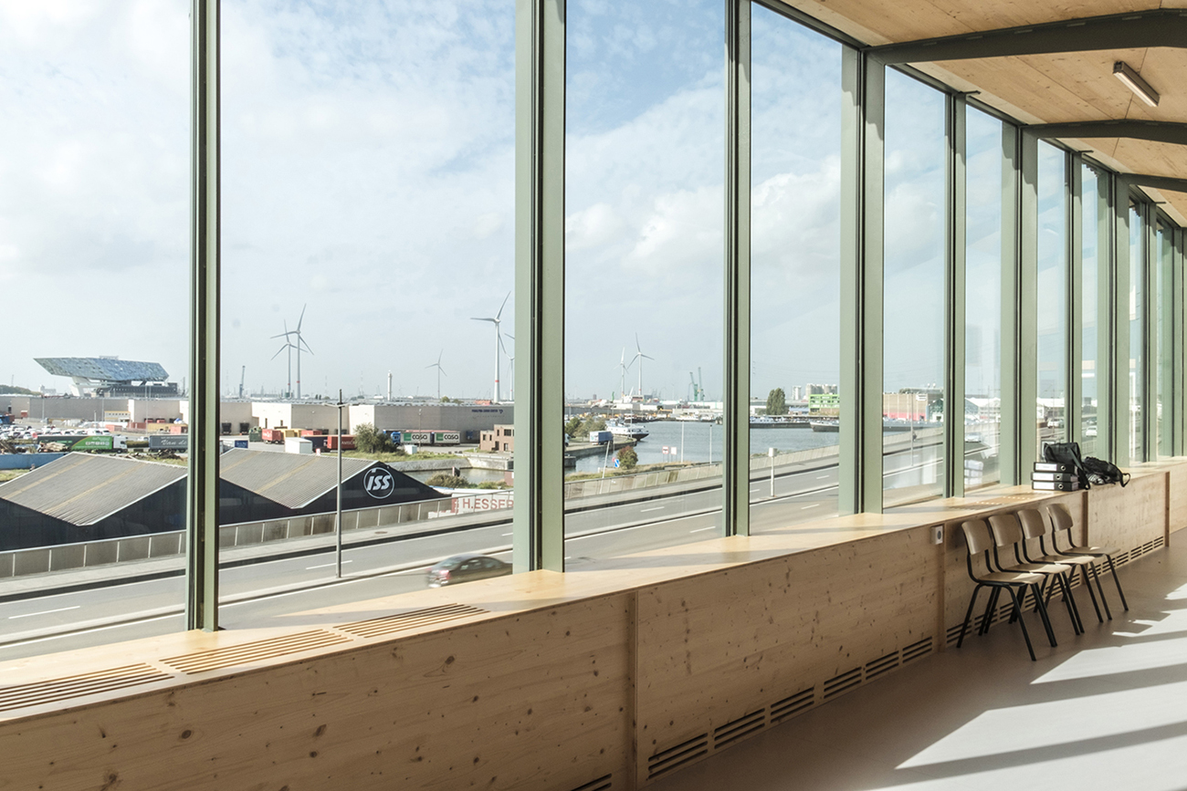 En Noorderlaan en Amberes, un piso adicional está diseñado para un edificio de oficinas existente. La nueva estructura interpreta el contexto industrial en el que se encuentra. De hecho, los techos, refiriéndose a las estructuras industriales, están ligeramente inclinados, una inclinación también debida al movimiento del viaducto