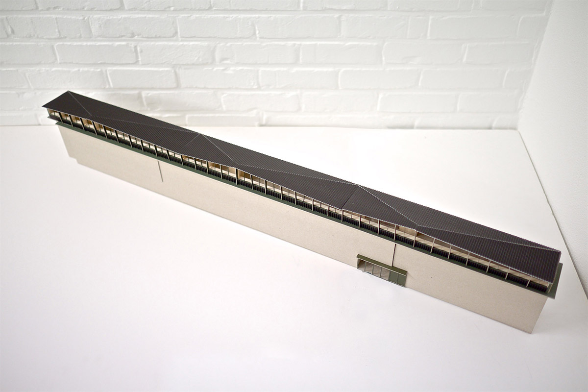 A nivel arquitectónico, la nueva estructura se separa completamente de la existente, en la forma, en la distribución interna y en los materiales utilizados. La estructura de acero está compuesta de placas CLT cubiertas con láminas onduladas oscuras