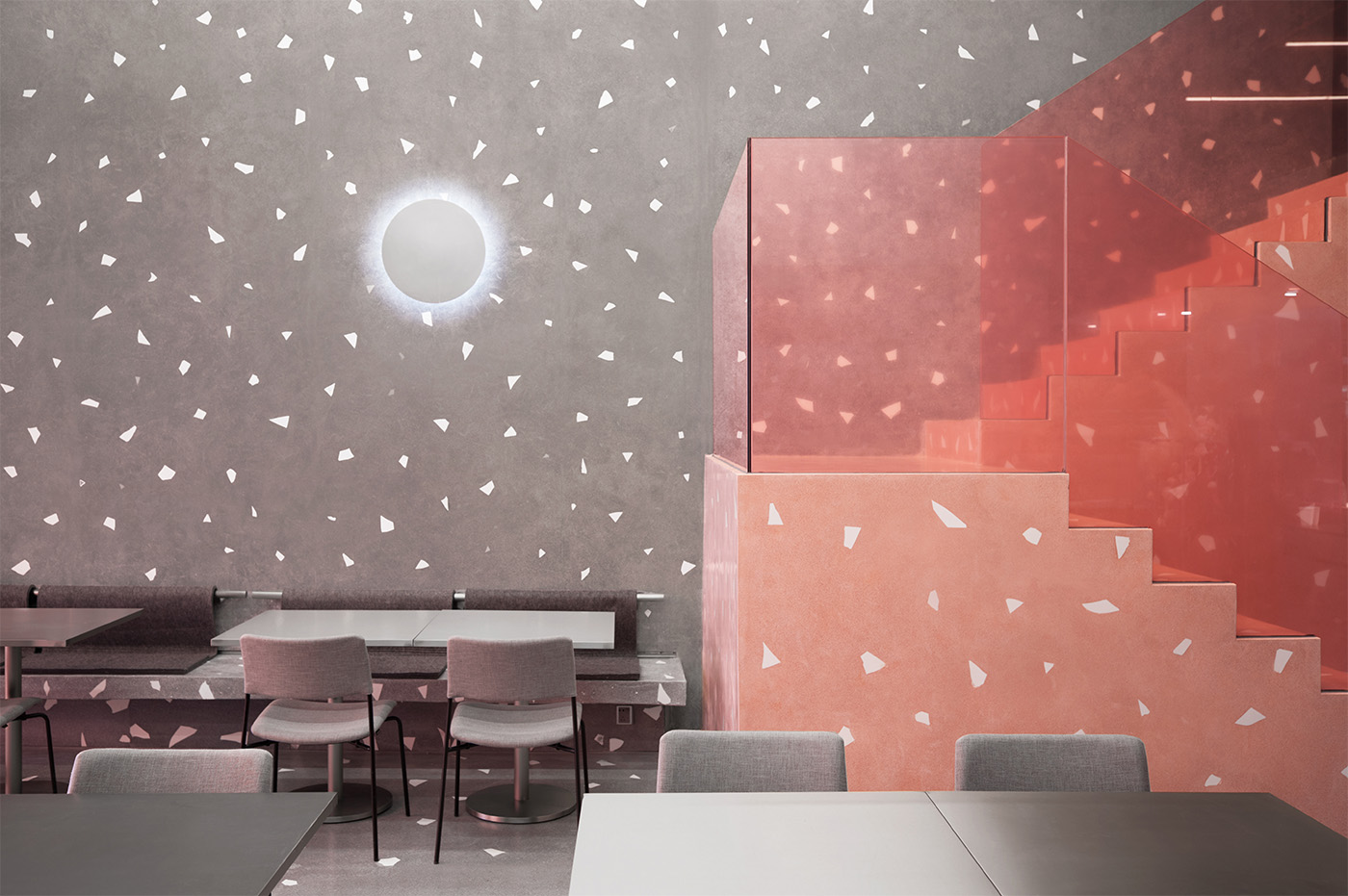 La escalera rosa sirve como elemento decorativo y como herramienta para el tráfico vertical. En la terraza, los asientos combinados con las mantas de piel de dos centímetros de grosor y los componentes metálicos crean una disposición ordenada mientras mantienen y mejoran la experiencia gastronómica única del cliente, inspirando la imaginación y la fantasía durante las comidas.
