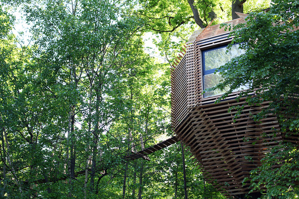 Origin, una habitación de hotel cómoda y funcional construida sobre el árbol, fiel a su inspiración, como un nido de pájaros. Es un proyecto único y hecho a medida, un verdadero reto arquitectónico, un punto de encuentro entre la poesía y la maestría de la carpintería