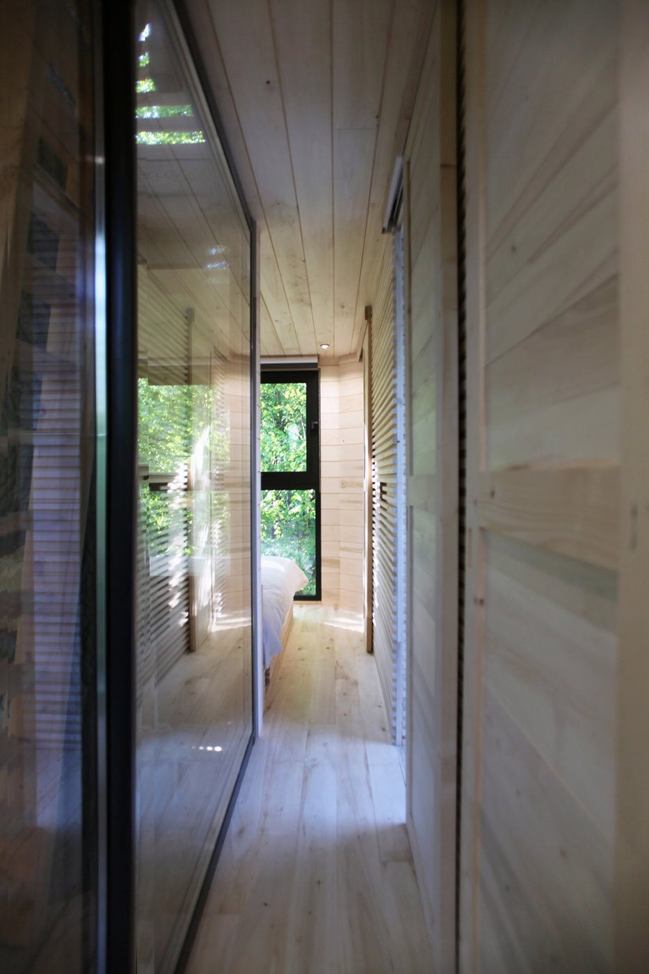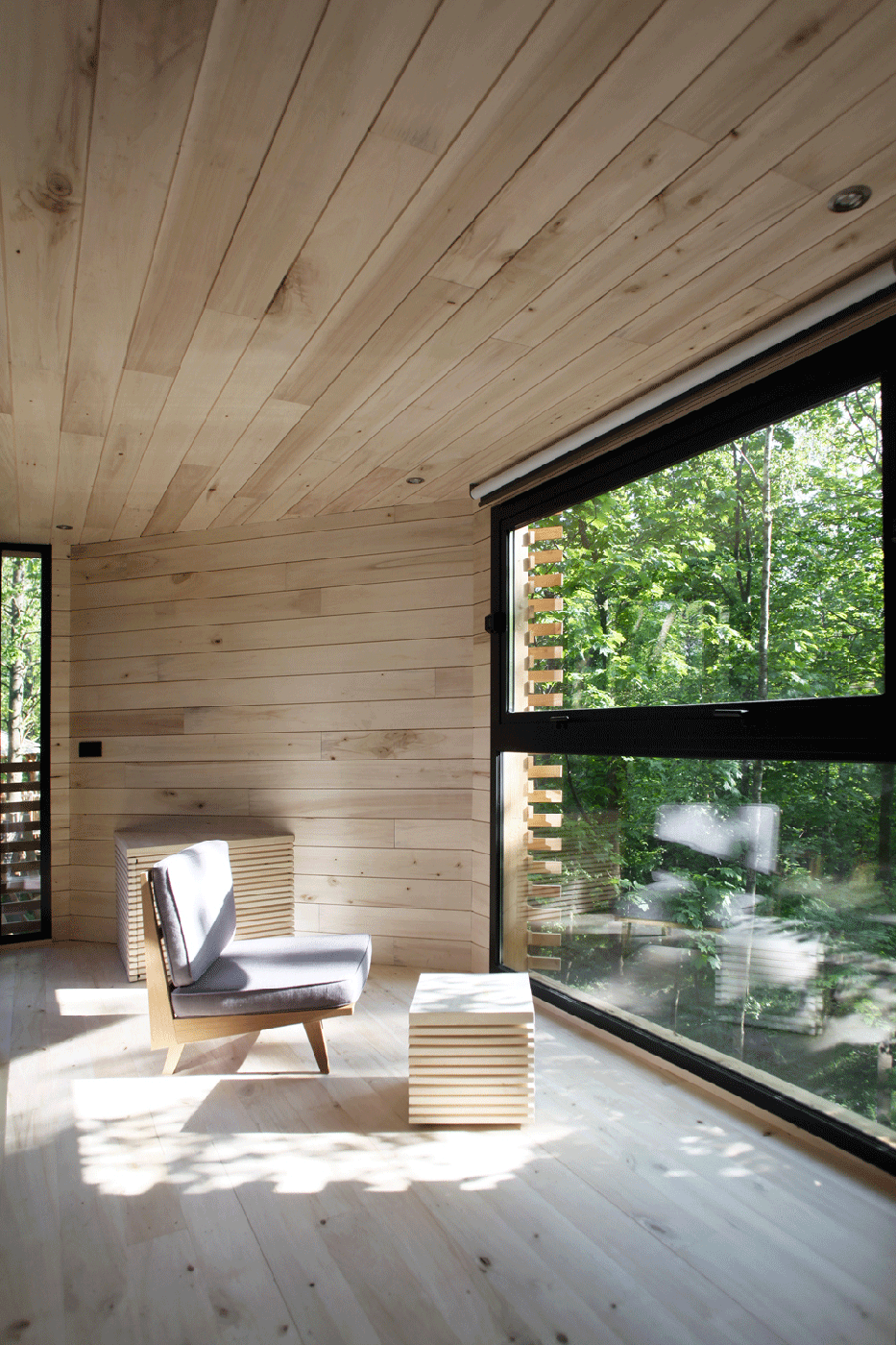 Una vez que se accede al patio, se percibe una sensación de protección como la de un nido, y se puede acceder fácilmente a la zona de estar a través de dos grandes puertas correderas de cristal. Un ambiente acogedor, luminoso e íntimo llena el espacio gracias a los grandes ventanales. El revestimiento interior de las paredes es de álamo. Cada uno de los espacios interiores cuenta con grandes ventanales que dan al bosque, ofreciendo una vista aérea del follaje de los robles centenarios del lugar