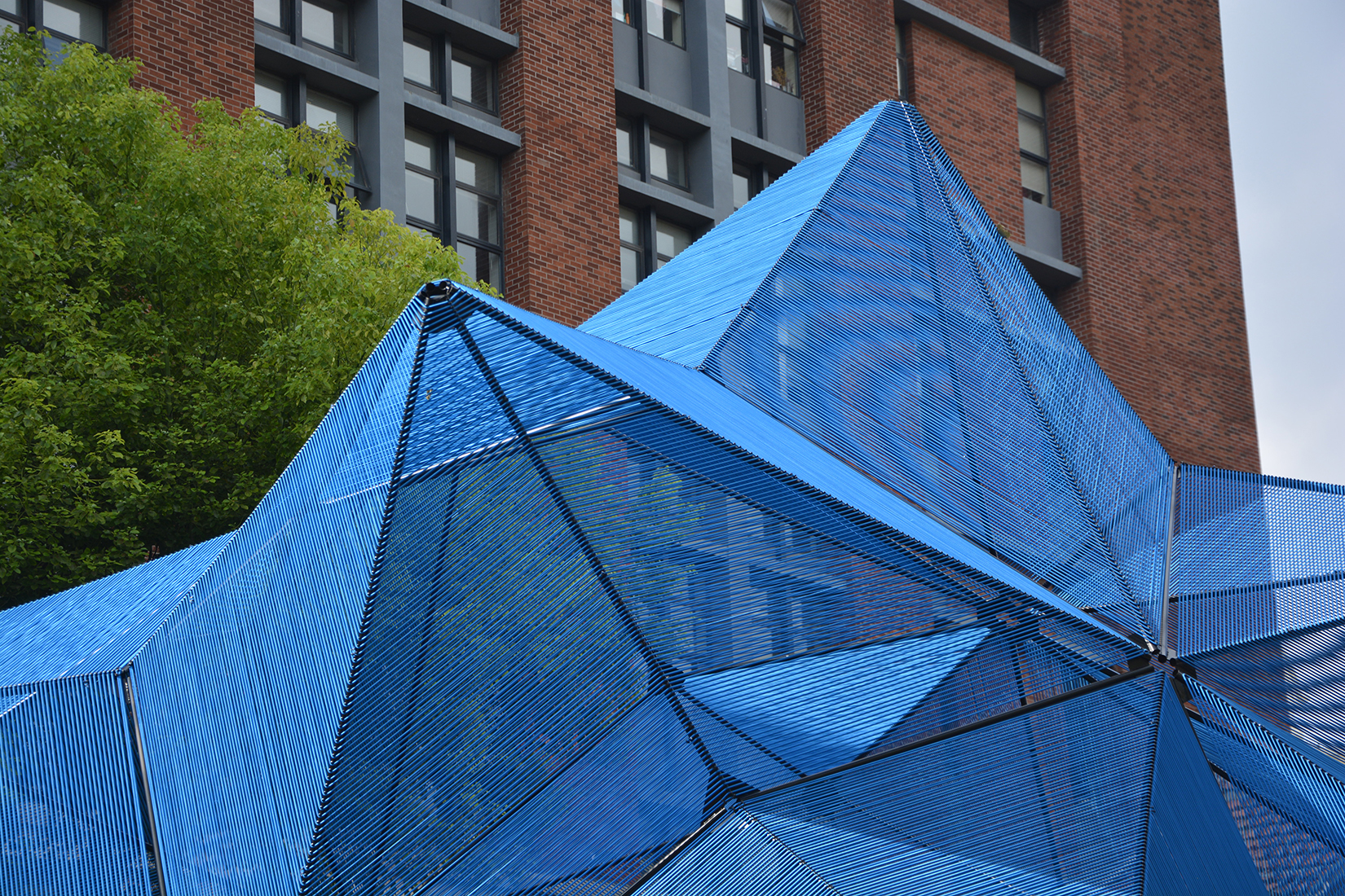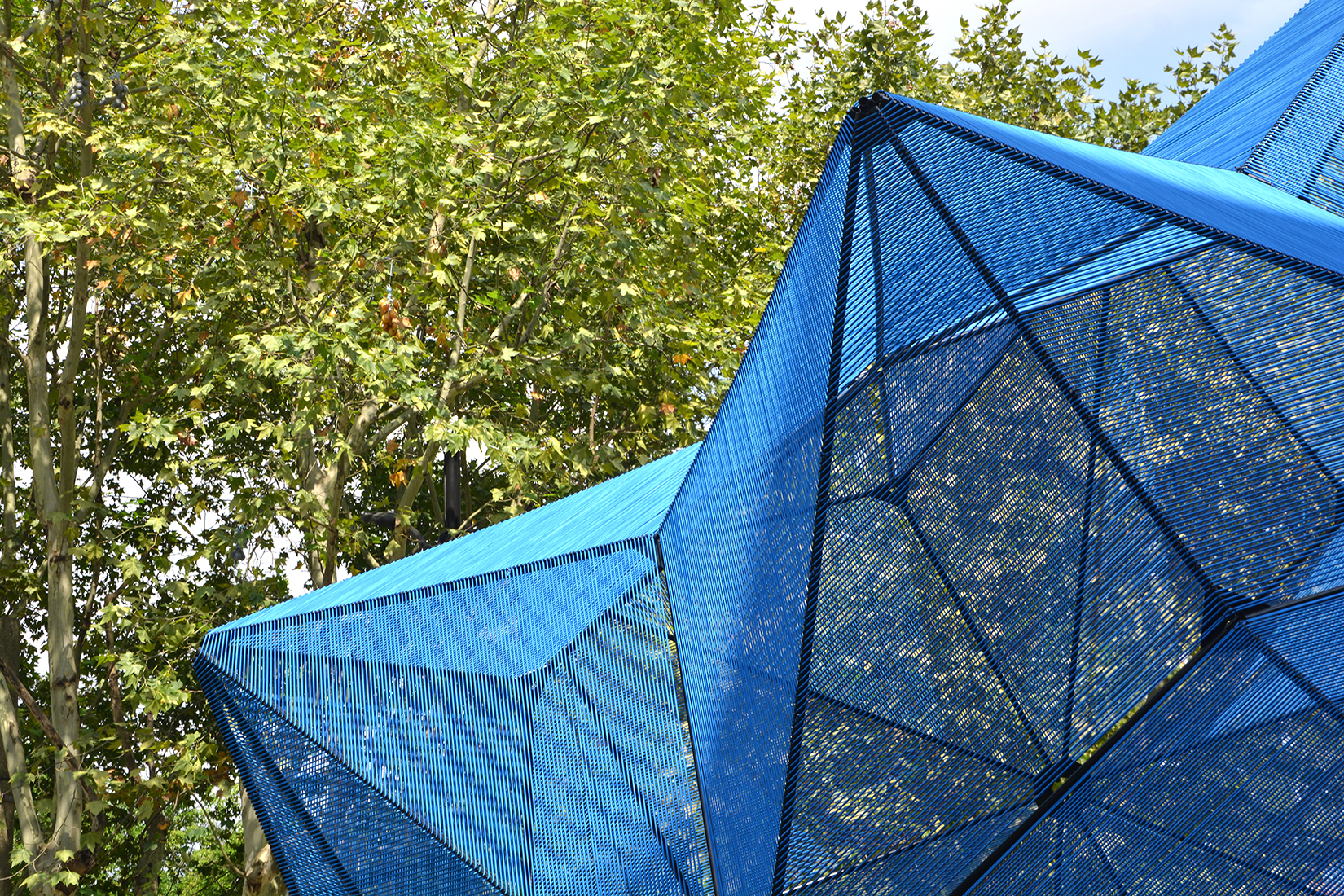 Su volumetría es el resultado de un hemisferio de un "poliedro rombicosacrón". Los postes extienden los bordes de esta cúpula y la elevan a 2 m 20 del suelo. Se utilizaron 7,5 km de cuerda para realizar esta instalación, así como una estructura tubular de metal para resistir la tensión y el tiempo