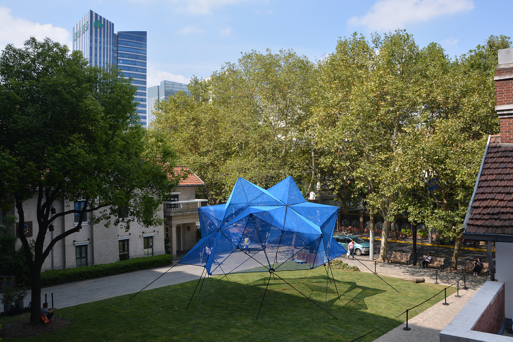 El gran volumen, fluctuante como una nube, se vuelve ligero e irrelevante. Como una cometa o una linterna, se eleva sobre la trama en una aparente fragilidad, invitando a los visitantes a observar y darse la vuelta. El trabajo ofrece un diálogo brillante y colorido entre la geometría y la materialidad, que cuestiona los límites entre el arte y la arquitectura